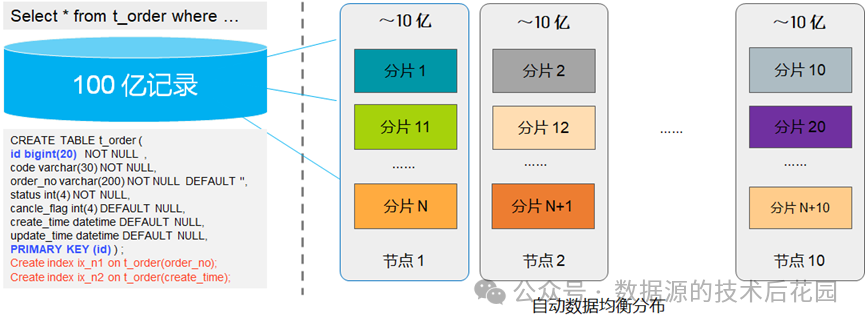 10)先分片再分区,对包含历史表等有日期字段的表,采用先分片再分区的策略。使用年份、月份等字段进行分区设计,将相同分片上的大表