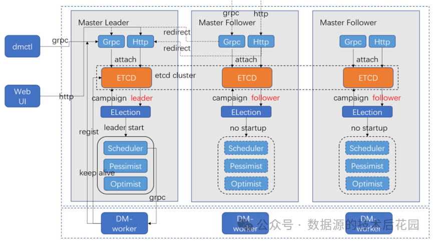 下图是DM master的内部架构,可以看到DM master内部是一个ETCD集群,默认情况下有一个Master Leader和多个Master Follower。每个Master自下而下包括多个组件:gRPC和HTTP接口(供其他组件调用如dmctl和WebUI)、etcd(内嵌etcd集群,也作为配置或状态的存储介质)、Election模块(周期性调用etcd进行选举)、Scheduler模块(注册及监听DM woker状态)、Pessimist和Optimist模块(对DDL进行悲观协调及乐观协调)。如果一个DM master发生故障,Election模块通过etcd选举出新的Leader节点并启动DM