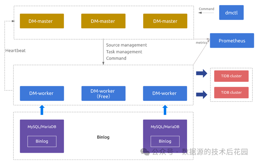TiDB的DM是一个支持高可用的架构,DM整体架构中包括三个组件:DM-master、DM-worker和dmctl,如下图所示。