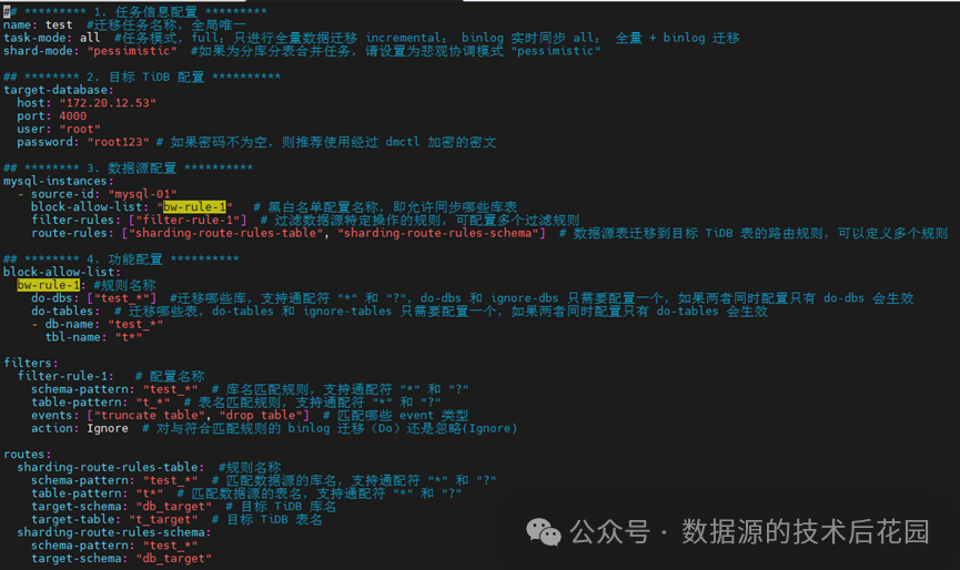 一个比较典型的迁移配置如下(完整的任务配置参考 DM 任务完整配置文件介绍 | PingCAP 文档中心 )