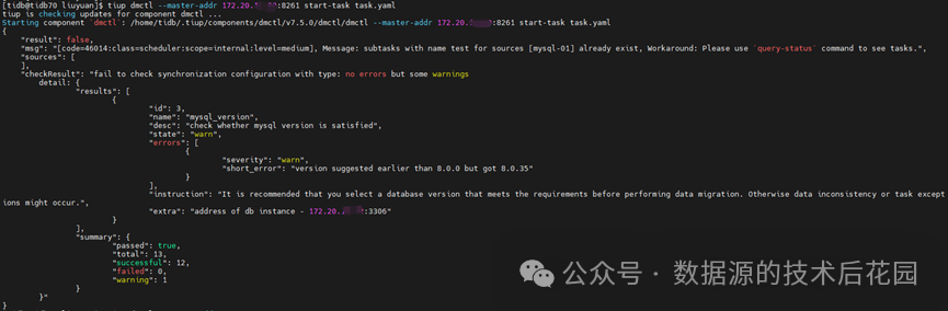 上图中有一个warning,提示数据源的版本过高,不过warning并不影响任务的创建。这时我们可以使用start-task来创建任务并使用query-status来查看创建的任务。