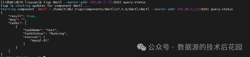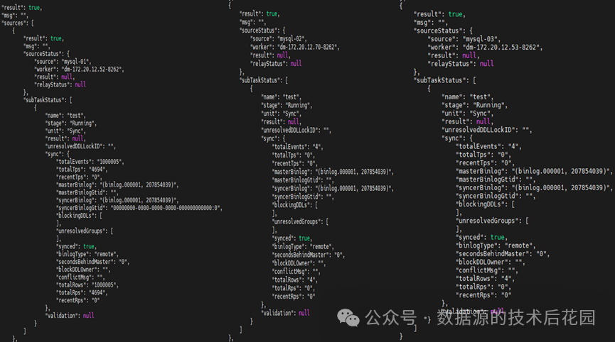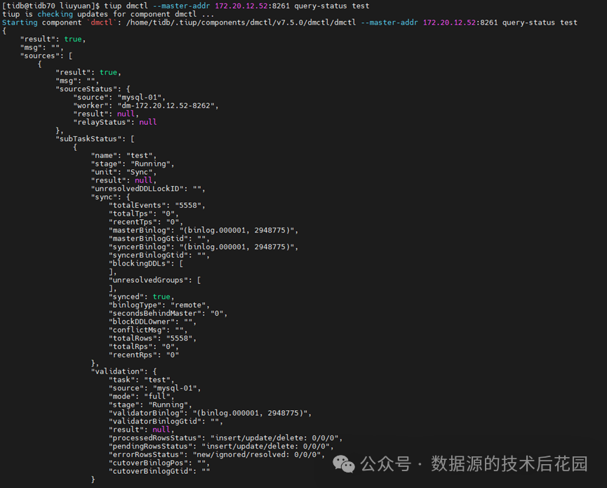 上面图1中说明DM当时有一个正在running的task,task的名称为test,引用的数据源为mysql-01。图2是对于test这个任务的详细信息输出,包括子任务的同步状态等,由于当前环境中未有可以迁移的表及数据,所有源库与TiDB目标库为同步状态"synced": true。