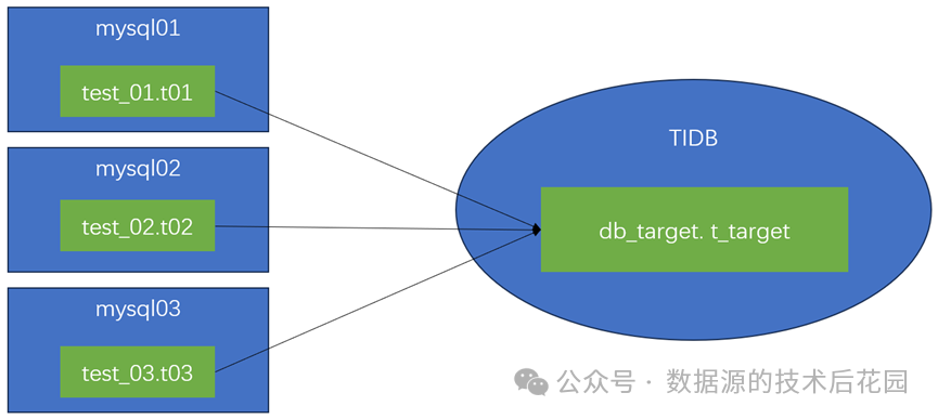 测试目的:利用routes配置,将3个MySQL中的3个表合并到一个TiDB表。