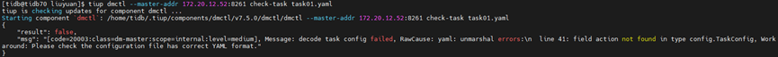 配置DM的task.yaml文件是比较严格的,用户需要较为仔细,好在check-task的输出也比较明确。作者在测试中模拟出几类问题场景,这里跟大家分享一下: