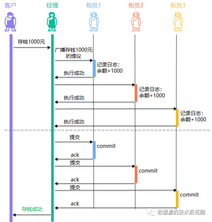 关于常规的2PC提交流程,可以使用下图中经典的客户存款例子来理解,图中经理相当于协调者的角色,柜员1~柜员3相当于三个参与者角色。