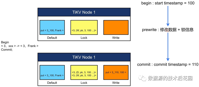 以上动作完成后,事务彻底提交完成,如果此时客户端想查询被修改的这条数据,逻辑是首先从TiKV节点的Write CF中查找最近一次修改的数据,比如3_110,这样便能得到3_110这个数据所在事务的开始时间是100,通过3_100去Default