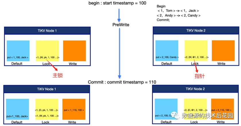 前面提到TiDB在事务中如果修改多条数据,只会在第一条记录上增加一把主锁,其他记录上的锁都是一个用于指向主锁指针。如下图所示,TiKV Node 2中Lock CF中的@1代表它是一个指针,指向Node 1中的锁。当有节点异常宕机后,会根据锁的指针来决定是否需要重做丢失的部分来保证最终的事务一致性。