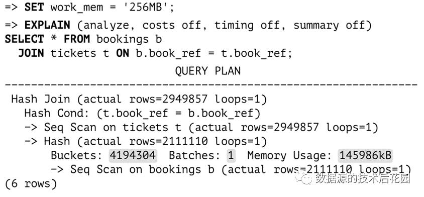 PostgreSQL中有关哈希连接的执行计划如下图所示,Hash Join节点是用ticket_flights表和hash table进行关联匹配的过程,Hash节点就是将tickets表映射到hash