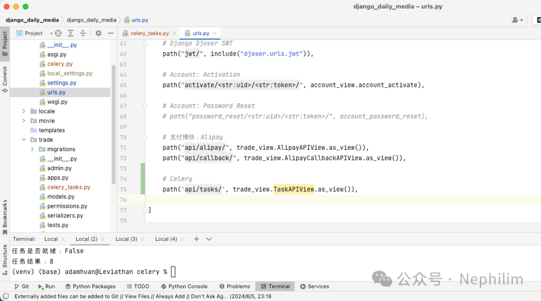 (venv) (base) adamhuan@Leviathan django_daily_media % cd celery(venv) (base) adamhuan@Leviathan celery %(venv) (base) adamhuan@Leviathan celery % python run_tasks.py任务是否就绪:False任务结果:8(venv) (base) adamhuan@Leviathan celery %