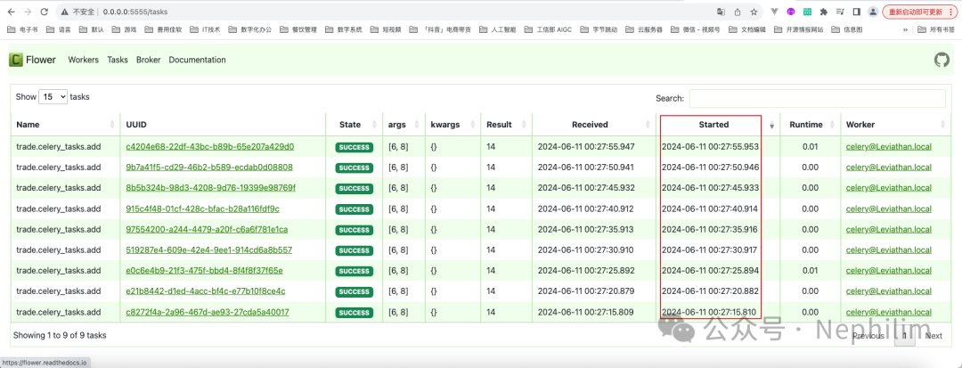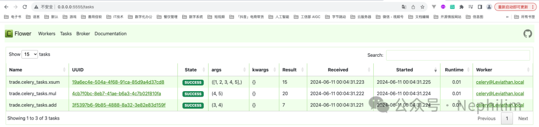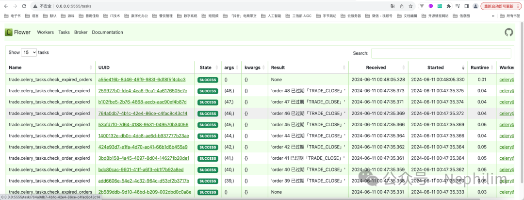 (venv) (base) adamhuan@Leviathan django_daily_media % celery -A django_daily_media flower[I 240611 00:27:08 command:168] Visit me at http://0.0.0.0:5555[I 240611 00:27:08 command:176] Broker: redis://localhost:6379/0[I 240611 00:27:08 command:177] Registered tasks:['celery.accumulate','celery.backend_cleanup','celery.chain','celery.chord','celery.chord_unlock','celery.chunks','celery.group','celery.map','celery.starmap','django_daily_media.celery.debug_task','trade.celery_tasks.add','trade.celery_tasks.mul','trade.celery_tasks.xsum'][I 240611 00:27:08 mixins:228] Connected to redis://localhost:6379/0