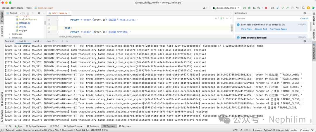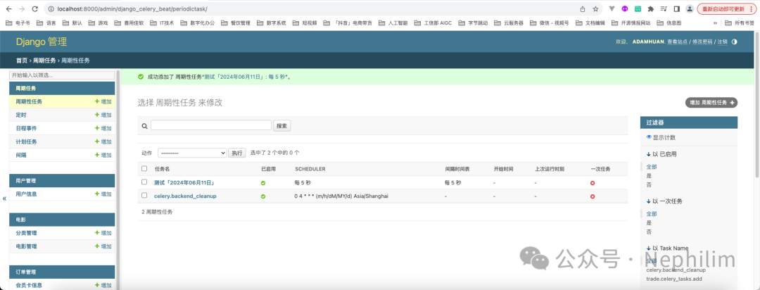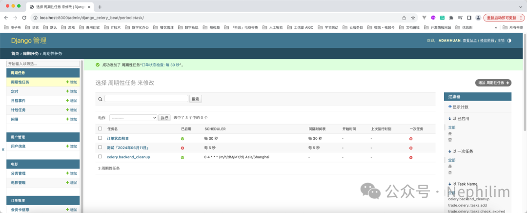 至此,关于Django中,通过Celery实现异步与定时任务的功能已经完成了。