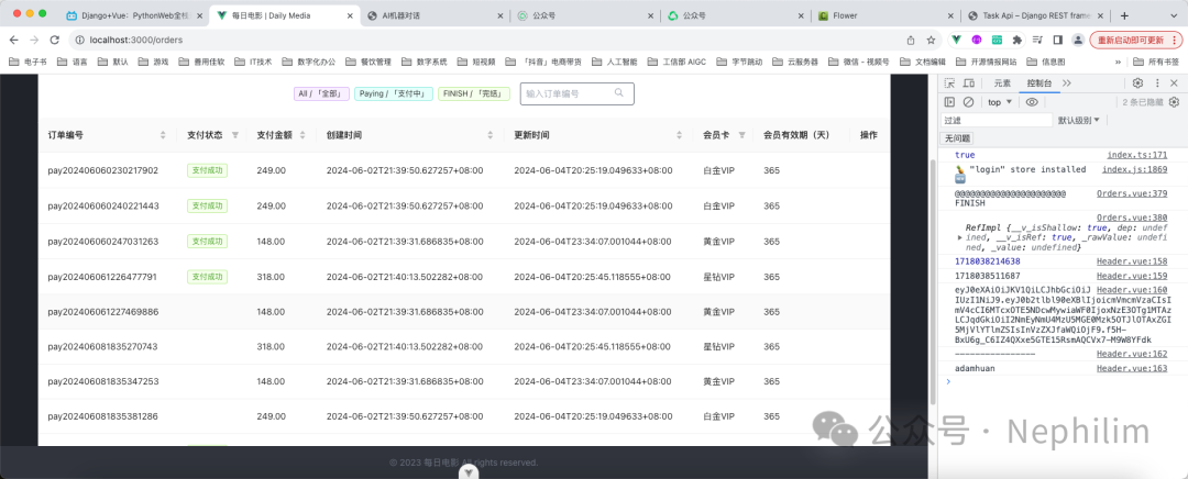from django.shortcuts import renderfrom django.utils import timezonefrom django_filters import rest_framework as filtersfrom django.conf import settingsfrom django.db import transactionfrom datetime import datetime, timedeltafrom rest_framework import viewsets,statusfrom rest_framework.views import APIViewfrom rest_framework.response import Responsefrom rest_framework import paginationfrom rest_framework.permissions import IsAdminUser, IsAuthenticated, SAFE_METHODSfrom trade.models import *from trade.serializers import *from trade.permissions import *from trade.celery_tasks import *from account.models import *from utils.error import *from utils.common import *from utils.payment_alipay import *# from utils.payment_alipay_new import *# Create your views here.# Cardclass CardFilter(filters.FilterSet):card_name = filters.CharFilter(lookup_expr='icontains')duration = filters.NumberFilter()class Meta:model = Cardfields = ['card_name', 'duration']class CardPagination(pagination.PageNumberPagination):page_size = 12max_page_size = 20page_size_query_param = 'page_size'class CardViewSet(viewsets.ModelViewSet):queryset = Card.objects.all()serializer_class = CardSerializerfilter_backends = (filters.DjangoFilterBackend,)filterset_class = CardFilterpagination_class = CardPagination# permission_classes = [# IsAdminUserOrReadonly,# ]# Orderclass OrderFilter(filters.FilterSet):pay_status = filters.CharFilter(field_name='pay_status',lookup_expr='icontains')order_sn = filters.CharFilter(field_name="order_sn",lookup_expr='icontains')class Meta:model = Orderfields = ['pay_status', 'order_sn']class OrderPagination(pagination.PageNumberPagination):page_size = 12max_page_size = 20page_size_query_param = 'page_size'class OrderViewset(viewsets.ModelViewSet):queryset = Order.objects.all()serializer_class = OrderSerializerfilter_backends = (filters.DjangoFilterBackend,)filterset_class = OrderFilterpagination_class = OrderPagination# permission_classes = [# IsAdminUserOrReadonly,# ]# 根据不同的场景选择不同的授权策略def get_permissions(self):if self.request.method in SAFE_METHODS:return [IsAuthenticated()]else:return [IsAdminUser()]# Alipayclass AlipayAPIView(APIView):# 发起支付宝支付「场景」:# 1. 创建新的支付# 2. 支付未完成的订单def get(self, request):# 判断卡号「card_id」是否正确card_id = request.GET.get("card_id", None)print("================")print(card_id)try:card = Card.objects.get(id=card_id)except:return Response(response_data(*TradeError.CardParamError))order_sn = request.GET.get('order_sn', None)if not order_sn:# 如果没有 order_sn 则需要创建订单# 订单号out_trade_no = "pay" + datetime.now().strftime("%Y%m%d%H%M%S") + get_random_code(4)# 创建订单try:Order.objects.create(user = Profile.objects.get(user=request.user),card = card,order_sn = out_trade_no,order_mount = card.card_price,pay_time = timezone.now(),)except:return Response(response_data(*TradeError.OrderCreateError))else:# 如果有 order_sn 则不需要创建订单# 支付之前没支付的订单try:order = Order.objects.get(order_sn=order_sn)if order.pay_status != 'PAYING':return Response(response_data(*TradeError.OrderStatusError))out_trade_no = order_snexcept:return Response(response_data(*TradeError.OrderStatusError))# 请求支付宝try:# pip install alipay-sdk-python --upgradealipay = Alipay()pay_url = alipay.trade_page(out_trade_no=out_trade_no,total_amount=str(card.card_price),subject=card.card_name,body="「支付宝 - 沙箱环境」支付",product_code="FAST_INSTANT_TRADE_PAY")# pip install python-alipay-sdk# 电脑网站支付 alipay.trade.page.pay# pay_url = alipay.api_alipay_trade_page_pay(# out_trade_no=out_trade_no,# total_amount=str(card.card_price),# subject=card.card_name,# return_url=settings.ALIPAY_RETURN_URL,# notify_url=settings.ALIPAY_NOTIFY_URL, # 可选,不填则使用默认 notify url# )# 返回return Response(pay_url)except:return Response(response_data(*TradeError.AlipayRequestError))class AlipayCallbackAPIView(APIView):def get(self, request):return Response("阿里支付 - 回调函数")def post(self, request):# =======================# 拿到异步返回的结果params = request.POST.dict()print(params)# =======================# 对异步返回结果的验签# ----------------# Step 1 - 在通知返回参数列表中,除去 sign、sign_type 两个参数外,凡是通知返回回来的参数皆是待验签的参数。# --- SIGN# del params['sign']sign = params.pop('sign')# --- SIGN_TYPEdel params['sign_type']# ----------------# Step 2 - 将剩下参数进行 url_decode,然后进行字典排序,组成字符串,得到待签名字符串# 对字典进行排序# 1. 列表生成式sorted_list = sorted([(k,v) for k,v in params.items() ])# 拼接字符串unsigned_string = '&'.join(f"{k}={v}" for k,v in sorted_list)# ----------------# Step 3 - 将签名参数(sign)使用 base64 解码为字节码串# Step 4 - 使用 RSA 的验签方法,通过签名字符串、签名参数(经过 base64 解码)及支付宝公钥验证签名# ALIPAY 的官方 PIP 包有提供方法解决「Step 3 Step 4」# from alipay.aop.api.util.SignatureUtils import verify_with_rsa# 该方法在单独实现的 ALIPAY 的工具类中有实现alipay = Alipay()if not alipay.verify_sign(unsigned_string=unsigned_string,sign=sign):print("==================")print("验签失败")return Response('验签失败')# ----------------# Step 5 - 需要严格按照如下描述校验通知数据的正确性# 1. 商家需要验证该通知数据中的 out_trade_no 是否为商家系统中创建的订单号。# 2. 判断 total_amount 是否确实为该订单的实际金额(即商家订单创建时的金额)。# 3. 校验通知中的 seller_id(或者 seller_email)是否为 out_trade_no 这笔单据的对应的操作方(有的时候,一个商家可能有多个 seller_id/seller_email)。# 4. 验证 app_id 是否为该商家本身。# ----------------# 上述 1、2、3、4 有任何一个验证不通过,则表明本次