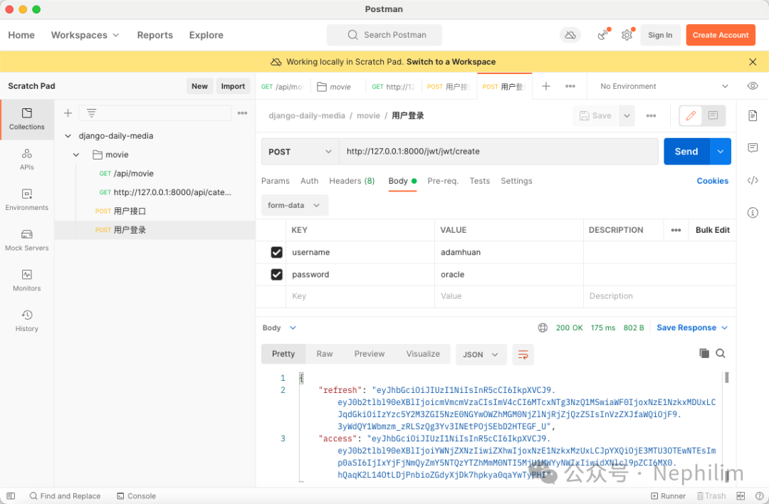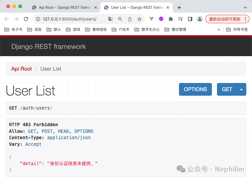 REST_FRAMEWORK = {# 分页'DEFAULT_PAGINATION_CLASS': 'rest_framework.pagination.PageNumberPagination',# 'PAGE_SIZE': 12,# 过滤器"DEFAULT_FILTER_BACKENDS": {'django_filters.rest_framework.DjangoFilterBackend',},# 验证"DEFAULT_AUTHENTICATION_CLASSES": {# 'rest_framework.authentication.BasicAuthentication',# 'rest_framework.authentication.TokenAuthentication',# 'rest_framework_simplejwt.authentication.JWTAuthentication',},}