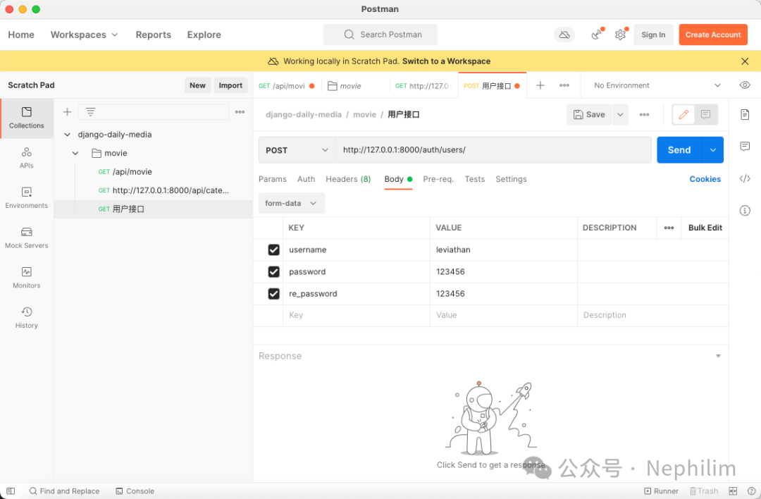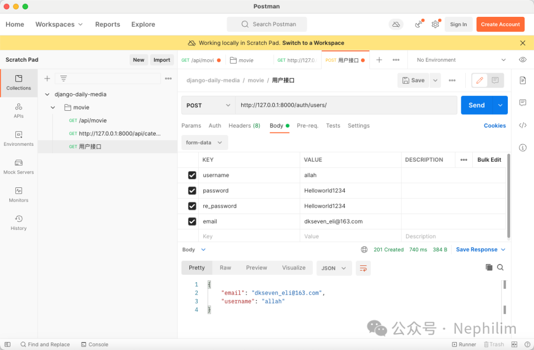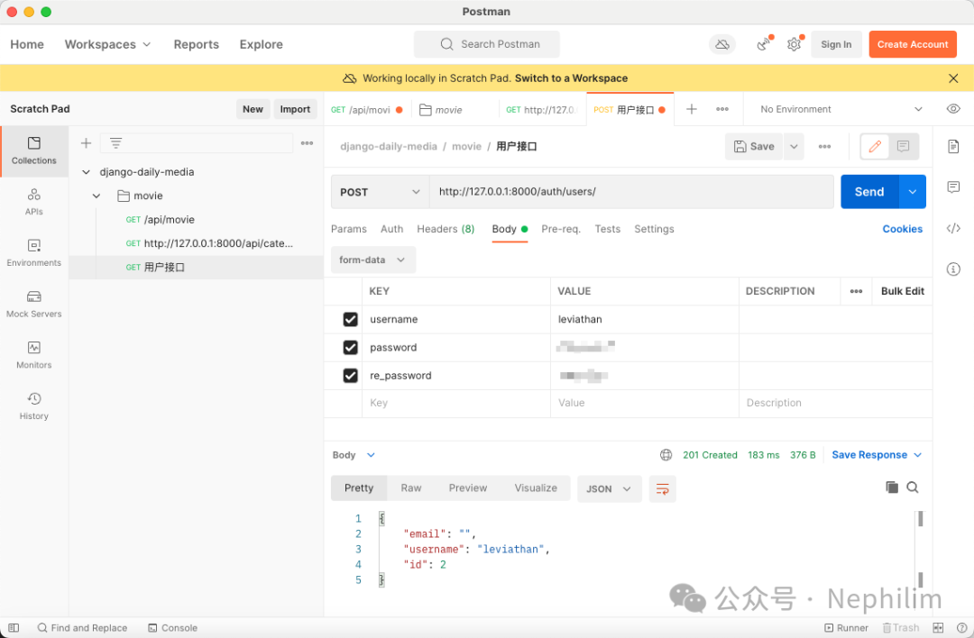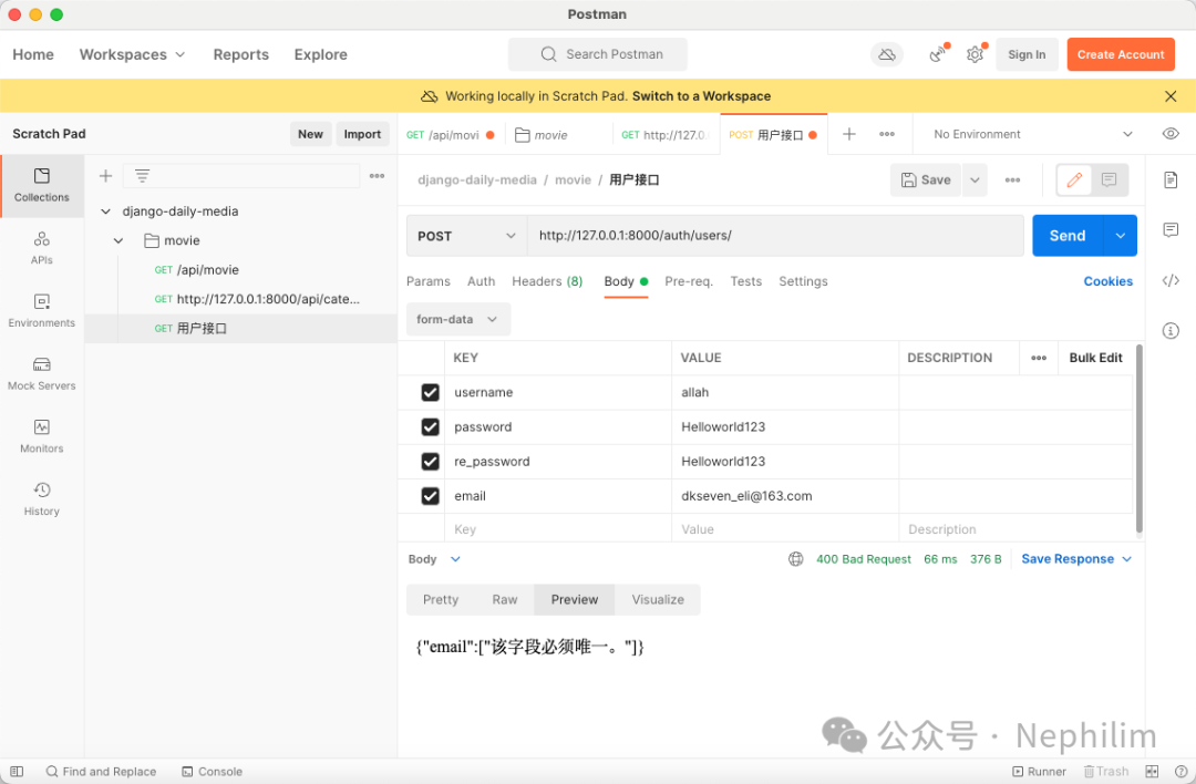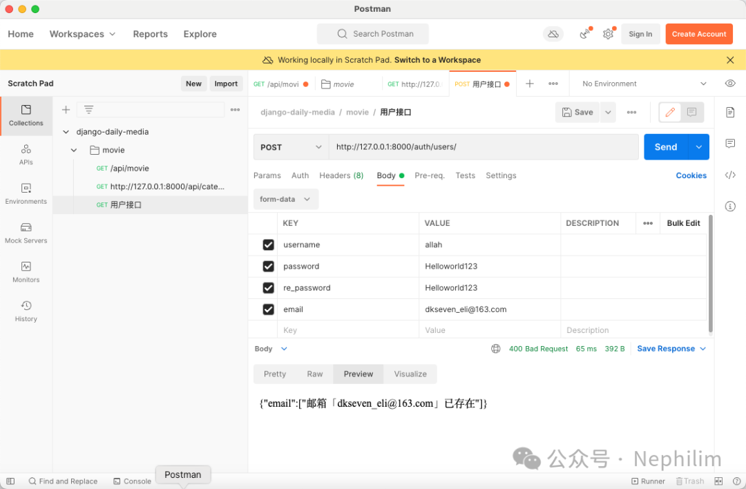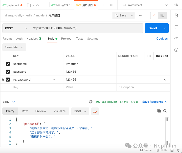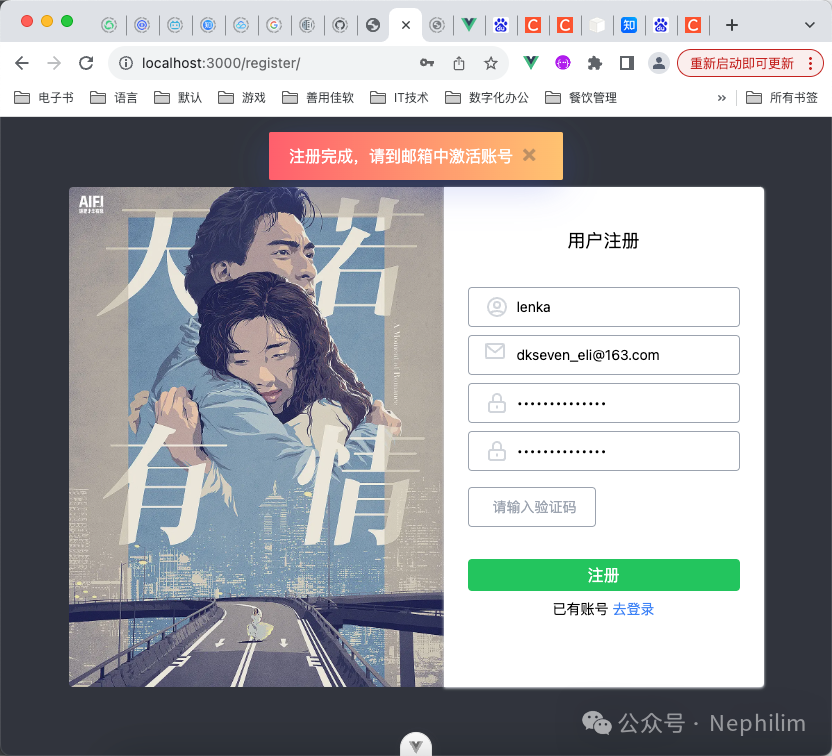 通过上面的步骤,我们实现了后端注册接口的开发,但真实的用户使用的时候,不会通过Postman使用接口的方式去注册网站。