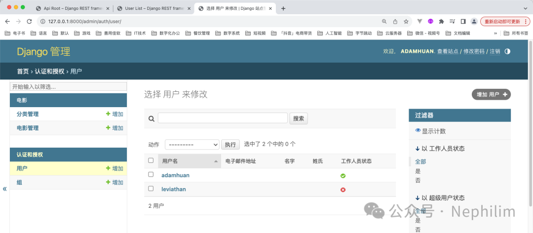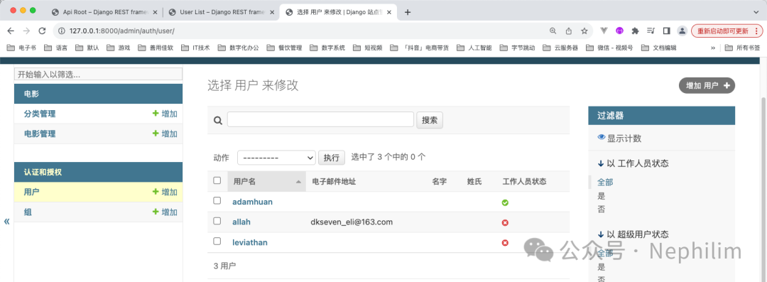 然后,在Django的后台「认证和授权 用户」中,就可以看到新增的用户了: