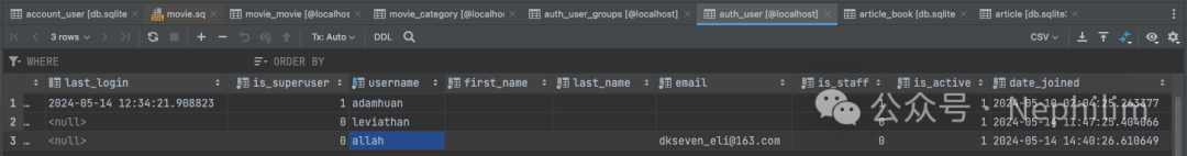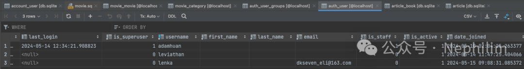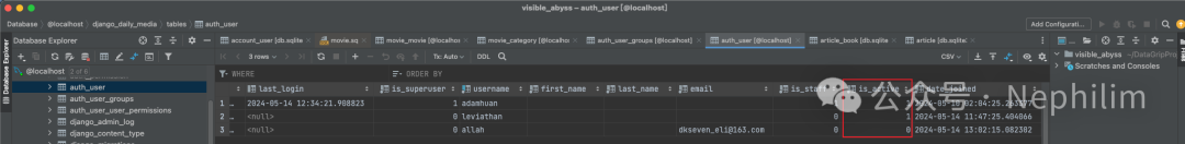 可以看到,当前该用户并没有激活「is_active」为「0」。