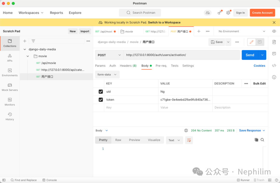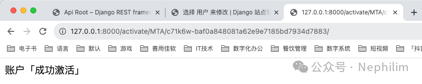 from django.shortcuts import renderfrom django.http import HttpResponseimport requests# Create your views here.def account_activate(request, uid, token):res = requests.post(url="http://127.0.0.1:8000/auth/users/activation/",data={"uid": uid,"token": token,})if res.status_code == 204:return HttpResponse("账户「成功激活」")return HttpResponse("请确认「激活链接」的正确性")