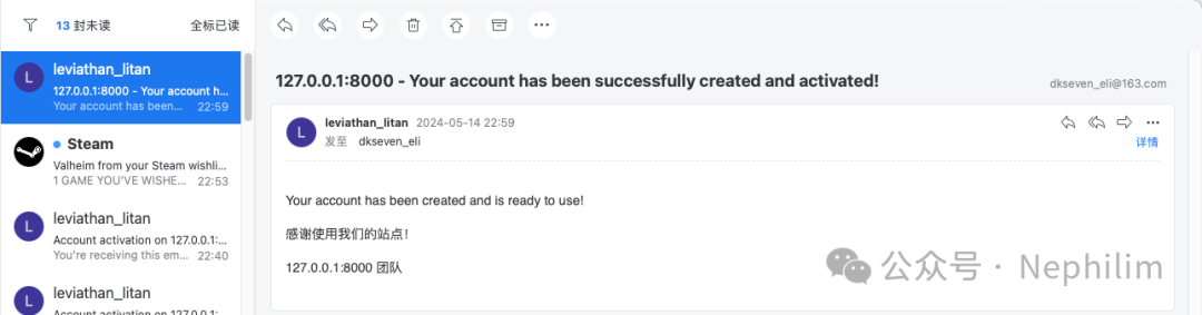 当你激活成功后,根据DJOSER的设置,你会收到一封激活成功的邮件: