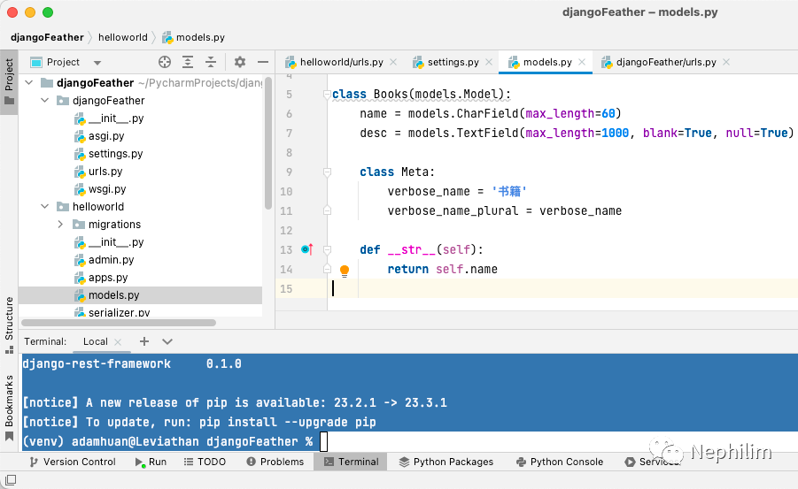 from django.db import models# Create your models here.class Books(models.Model):name = models.CharField(max_length=60)desc = models.TextField(max_length=1000, blank=True, null=True)class Meta:verbose_name = '书籍'verbose_name_plural = verbose_namedef __str__(self):return self.name