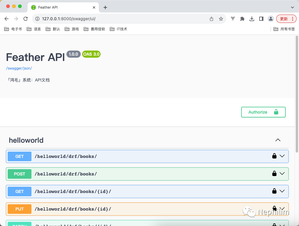 SPECTACULAR_SETTINGS = {# 自定义 OpenAPI 描述信息'TITLE': 'Feather API','DESCRIPTION': '「鸿毛」系统:API文档','VERSION': '1.0.0','SERVE_INCLUDE_SCHEMA': False,}