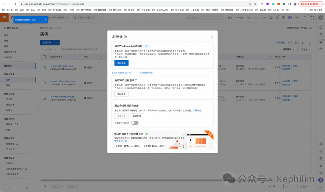在前面的「实例」界面中,找到「远程连接」,点击后,你会看到如下的界面: