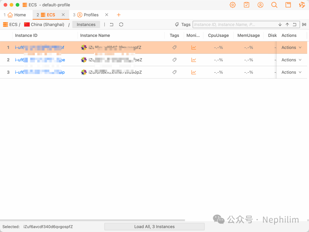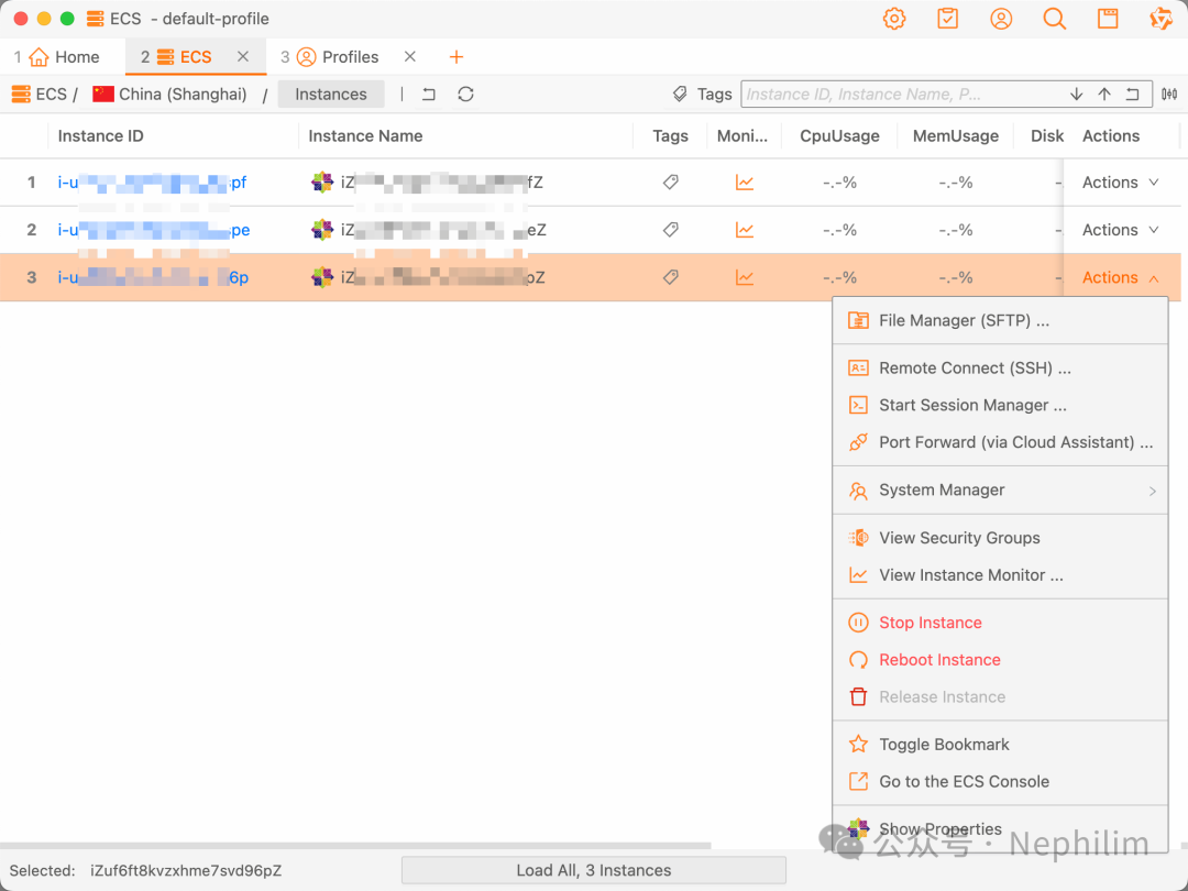 然后,点击后面的「Action」就可以很方便的直接连接到目标的ECS主机了: