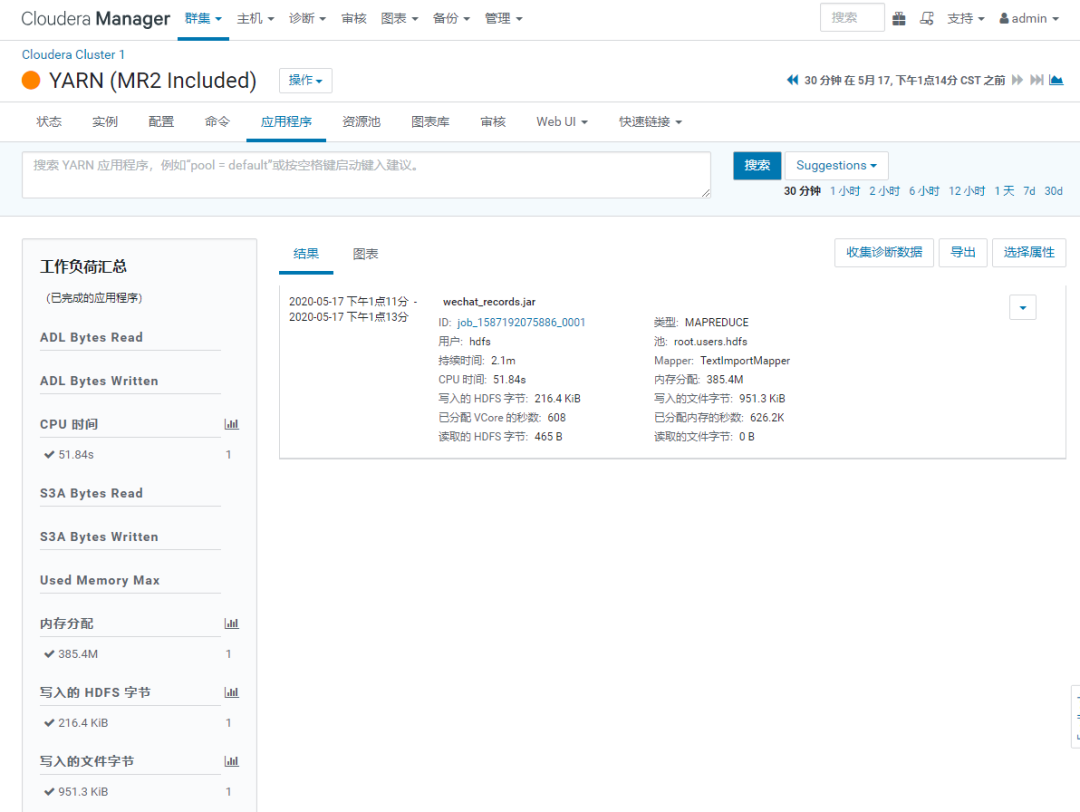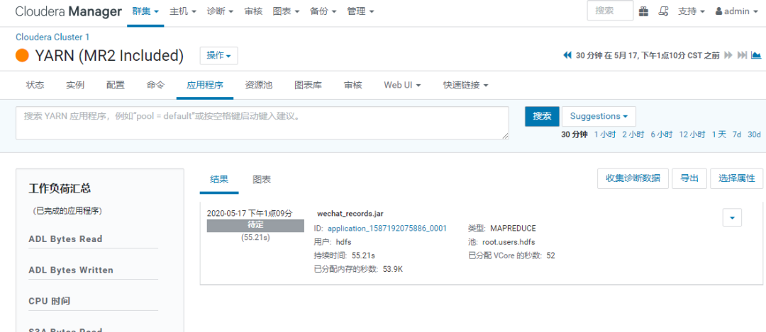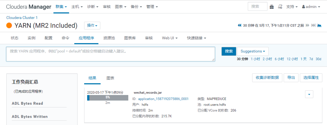 这个过程中,可以在【YARN】的应用程序中看到后台的任务运行情况: