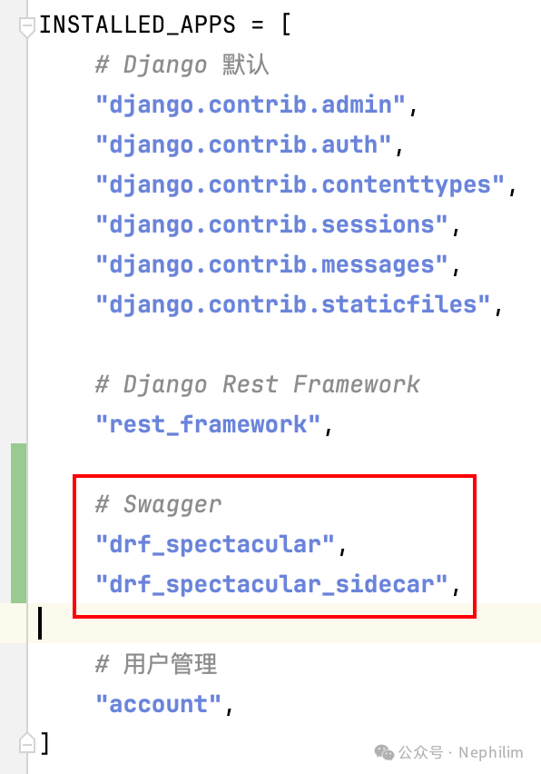 """Django settings for djangoProject_AdamhuanBase project.Generated by 'django-admin startproject' using Django 5.1.2.For more information on this file, seehttps://docs.djangoproject.com/en/5.1/topics/settings/For the full list of settings and their values, seehttps://docs.djangoproject.com/en/5.1/ref/settings/"""from pathlib import Path# Build paths inside the project like this: BASE_DIR 'subdir'.BASE_DIR = Path(__file__).resolve().parent.parent# Quick-start development settings - unsuitable for production# See https://docs.djangoproject.com/en/5.1/howto/deployment/checklist/# SECURITY WARNING: keep the secret key used in production secret!SECRET_KEY = "django-insecure-b!+z92+09x957wqzbl@&6z*k3eakn)g$0pg^2h0_quaoh)pd5v"# SECURITY WARNING: don't run with debug turned on in production!DEBUG = TrueALLOWED_HOSTS = []# Application definitionINSTALLED_APPS = [# Django 默认"django.contrib.admin","django.contrib.auth","django.contrib.contenttypes","django.contrib.sessions","django.contrib.messages","django.contrib.staticfiles",# Django Rest Framework"rest_framework",# Swagger"drf_spectacular","drf_spectacular_sidecar",# 用户管理"account",]MIDDLEWARE = ["django.middleware.security.SecurityMiddleware","django.contrib.sessions.middleware.SessionMiddleware","django.middleware.common.CommonMiddleware","django.middleware.csrf.CsrfViewMiddleware","django.contrib.auth.middleware.AuthenticationMiddleware","django.contrib.messages.middleware.MessageMiddleware","django.middleware.clickjacking.XFrameOptionsMiddleware",]ROOT_URLCONF = "djangoProject_AdamhuanBase.urls"TEMPLATES = [{"BACKEND": "django.template.backends.django.DjangoTemplates","DIRS": [BASE_DIR 'templates'],"APP_DIRS": True,"OPTIONS": {"context_processors": ["django.template.context_processors.debug","django.template.context_processors.request","django.contrib.auth.context_processors.auth","django.contrib.messages.context_processors.messages",],},},]WSGI_APPLICATION = "djangoProject_AdamhuanBase.wsgi.application"# Database# https://docs.djangoproject.com/en/5.1/ref/settings/#databasesDATABASES = {"default": {"ENGINE": "django.db.backends.sqlite3","NAME": BASE_DIR "db.sqlite3",}}# Password validation# https://docs.djangoproject.com/en/5.1/ref/settings/#auth-password-validatorsAUTH_PASSWORD_VALIDATORS = [{"NAME": "django.contrib.auth.password_validation.UserAttributeSimilarityValidator",},{"NAME": "django.contrib.auth.password_validation.MinimumLengthValidator",},{"NAME": "django.contrib.auth.password_validation.CommonPasswordValidator",},{"NAME": "django.contrib.auth.password_validation.NumericPasswordValidator",},]# Internationalization# https://docs.djangoproject.com/en/5.1/topics/i18n/# LANGUAGE_CODE = "en-us"LANGUAGE_CODE = "zh-hans"# TIME_ZONE = "UTC"TIME_ZONE = "Asia/Shanghai"USE_I18N = TrueUSE_TZ = True# Static files (CSS, JavaScript, Images)# https://docs.djangoproject.com/en/5.1/howto/static-files/STATIC_URL = "static/"# Default primary key field type# https://docs.djangoproject.com/en/5.1/ref/settings/#default-auto-fieldDEFAULT_AUTO_FIELD = "django.db.models.BigAutoField"# Django Rest FrameworkREST_FRAMEWORK = {# Swagger'DEFAULT_SCHEMA_CLASS': 'drf_spectacular.openapi.AutoSchema'}# SwaggerSPECTACULAR_SETTINGS = {# SIDECAR'SWAGGER_UI_DIST': 'SIDECAR','SWAGGER_UI_FAVICON_HREF': 'SIDECAR','REDOC_DIST': 'SIDECAR',# 自定义 OpenAPI 描述信息'TITLE': 'xxxxxxx','DESCRIPTION': 'xxxxxxx','VERSION': '1.0.0','SERVE_INCLUDE_SCHEMA': False,}