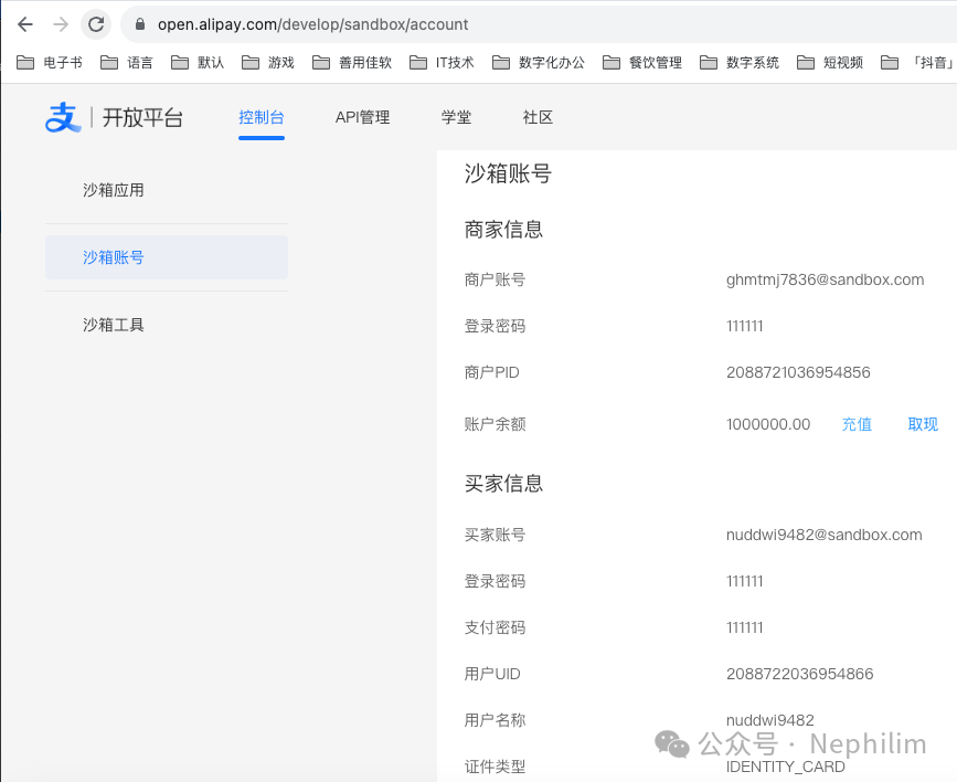 沙箱账号是支付宝自动分配的,其中的余额都是假的,你可以随意充值或提现,都只是数字的变化,用于测试你开发的网站或应用的「支付功能及其相关逻辑」是否运行正常: