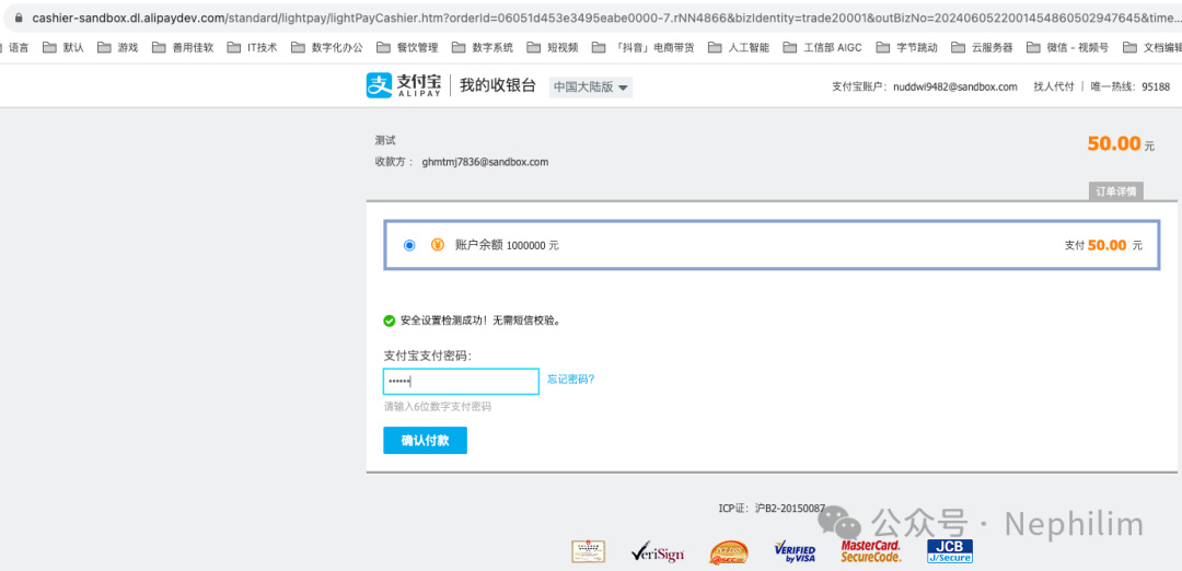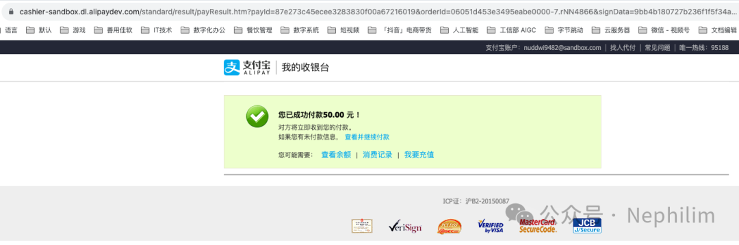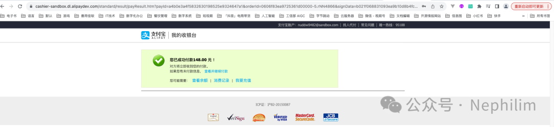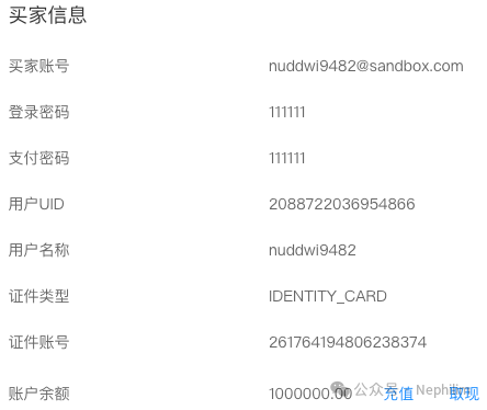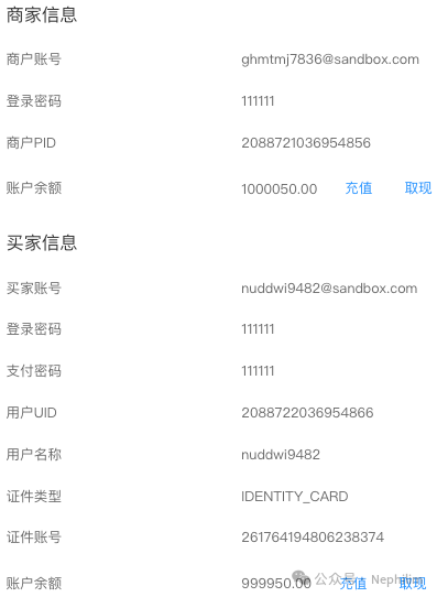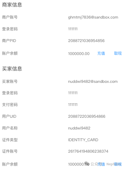 注意,上面的商家信息与买家信息都是之前在「沙箱环境」的「沙箱账户」中提供的。