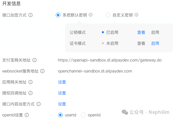 # ======================================# 支付宝沙箱环境# ======================================# -----------------------# 支付宝网关地址# 支付宝沙箱网关地址,开发者在沙箱环境调用 OpenAPI 发送 http(s) 请求的目标地址,需配置在AlipayClient中。ALIPAY_SERVER_URL = "https://openapi-sandbox.dl.alipaydev.com/gateway.do"# -----------------------# APPIDALIPAY_APP_ID = "9021000137680887"# -----------------------# 接口加签方式:「公钥模式 - 私钥」ALIPAY_APP_PRIVATE_KEY = "MIIEpQIBAAKCAQEAu26zZ9ufwCpCxf88IVIEhz4jGsMTfnt9X1HNjJ/mog8KBTgE9PwxW7ehVYgAgkNP3jpMqSQzfouRNYeqhgbgNFCtE6CpFRSmapH8X0//dZ0i2AIX1xxGATwNB4KlzAohKQMLc4DHMMfBbptuVGdzIRl1o/m4PYDS9Fs6ko3diJNTKzA+L9SS/DZLQH6tsyp7RdstQ/LPo5/1Zol03+jShioRreHwmmI0PK3JjsYOb5arH+3tCVRf3lL3fWKavmT9Q2lFgZQmTg9C/466bRNoLYWeIV/Z9c0T9br3Mmj1/b7hbgz/pLWvvGrhVYvrsyrc2nLRrRZJ6SLt1Z7bcd6DmwIDAQABAoIBAASNk94Z/69zV1vn71X/4AxI/iFQS9DuvwTpv8yCtd+J7fxid/xbg/duZoTlYN3JNM95KxOQxY91ZHmgagwHbrrWmt23MWRJtCEymqbWEqaQwp/srReUoD63brmX+t8R/+w3HrgXkL8mmxRMwklamflb3Pe2wTr9PiKhdLLKr2752ozjwi/DBV1Pei8wKVjzYwYkRfAKFytmmlgFnl1n2BQStXDKAcuA9rJnuMVF4D5ZRVVuuR04vNMLJWyzbN/az8+Tvd/JIWD0svCO5IiXZKYkQ0pD1VCZNOe1hG7RFq79+15wADjrq7ztH6+BYmNed+gevq/htfseBtPdiuWHtIECgYEA4613083+8JmSrgeESheg4tZwG7ouhO/VCINfSAy2QUERE24yanqvKKb2ZJpUUTC3CqjYfjpJJnGWfqKVSpg72ObCWjMH96BBzX+xCVC2n8nb6cs9vwC8c3t3RZ55U86sABzYd3s6RSog3xPefN+bqGmfLNxRWDat61+PaiwNWHMCgYEA0r+ZsJHhrJ+b+g9vXkhxzO7jVk/fbyA2D9eXx/85Z3lkpjV7pq9WEXmrTkhHr7OyAnFJH7O7IvKHpzDbNeSaZt9L/gk9hdIhvLG9/6qGZHGqwrlUV/5OxuxeCu5ihyfkMF2HFDwnDJDdNPgtxYoYU4rFr1Pr4XvIUKEYpYW4ZjkCgYEAiBIki3GR7DnccCYN6jo07V07o1aidtDfgTcCuwzd4CIDEpnJh9nK1YDzwSx7OArlWnmO6eHr1g4M46JHl01kdz1y6nWVTWl56ldmdyrF+rmptRDC1mSaPGqN3g3YdT4PjgGvXblIGg4Tlz9IuVjqrrxxZV5HP3FugD2ceNfbIgECgYEAsJ0VJV376/iOdI8+25qGlCGWrxycuLob1Ebu0hJXfxnCeW/UwimqTVbTcvUr7lj/UwCxMTokF/N8L2bILm/33UJAoxIHVwB0eXfTLFEx8zc2zZ0Wy+85AYfQgASq2W1a1BVtQE3ww50bZGqfoS5LmKdxZ69CvGJJyxhWWVCo6jECgYEAqk8+cx2pnvF89zTkGXvvuC7898/ZyNBHnSNGO6dLRZE9heiEfvmjqDgVNoxDhQpObMxfv4HdBtHqd9gCF7Oxj4TbicCwaqytDtlLyQs3Ia7SGZ+U2PRf9kqfbm9OakI8UONDQ9JhMjuY7jspaoROjv+X5geHJDsnw1/5BGeu18Q="# -----------------------# 接口加签方式:「公钥模式 - 支付宝公钥」ALIPAY_PUBLIC_KEY = "MIIBIjANBgkqhkiG9w0BAQEFAAOCAQ8AMIIBCgKCAQEA6Zt8CyUbB+W+zk6a6zCFMFpf2QX4RGwDke9fg5WX9A4SiDffw9Q+M+wcclJglHO5/5v0DR0LcUz8MF0wVK4za/iP0YWFCRWy4vVRPfDVDkqOXaIr4cDr7e1q7ayX1y2LA0TQAYMWXdOEbCyehaJU1+C8Mgs/G0JnwSXuZ4h/BBprnfzG3/Lc6pAIwhH3KbiMaEZIRi8j0AlUIsoDZf834SDm7LusluhY3chG0vQI5BjbgWzVmoNB3XSenoJNhqjcoaC9abz9DWJkftr6Z92DMPFqF//AjEsDpQGWF2froRbXZOqHAumtDi5zm+xrP0AGsMUF5kwrEoGw2DNEyxGfCQIDAQAB"