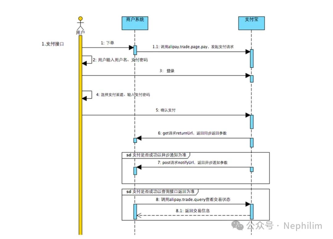 1. 商家系统调用 alipay.trade.page.pay(统一收单下单并支付页面接口)向支付宝发起支付请求,支付宝对商家请求参数进行校验,而后重新定向至用户登录页面。