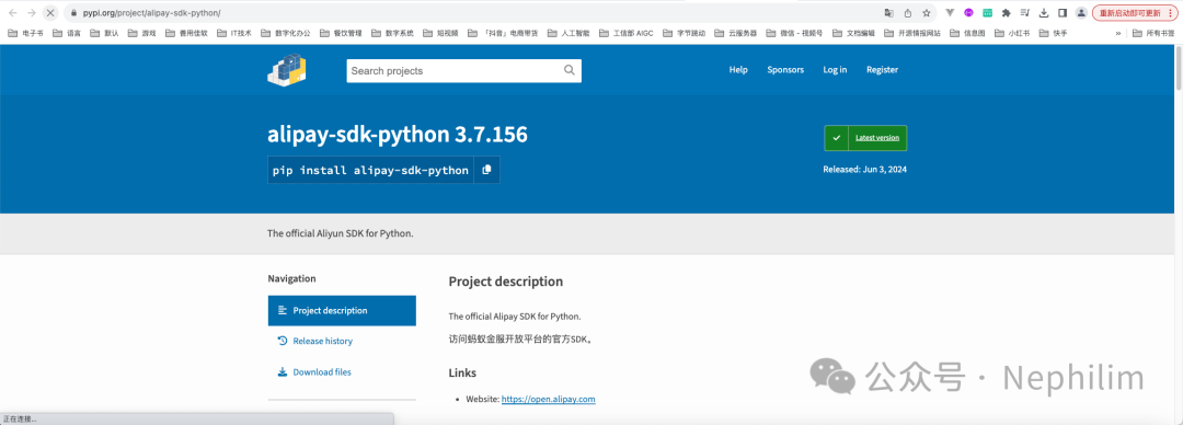 (venv) (base) adamhuan@Leviathan django_daily_media % pip install alipay-sdk-pythonLooking in indexes: https://mirrors.aliyun.com/pypi/simple/Collecting alipay-sdk-pythonDownloading https://mirrors.aliyun.com/pypi/packages/78/c2/517f8f9a9714b742f8cb1040e45ac7961ebd0d9f02ca3709ac38d48616a5/alipay_sdk_python-3.7.137-py3-none-any.whl (22.0 MB)━━━━━━━━━━━━━━━━━━━━━━━━━━━━━━━━━━━━━━━━ 22.0/22.0 MB 344.4 kB/s eta 0:00:00Collecting pycryptodome (from alipay-sdk-python)Downloading https://mirrors.aliyun.com/pypi/packages/ff/96/b0d494defb3346378086848a8ece5ddfd138a66c4a05e038fca873b2518c/pycryptodome-3.20.0-cp35-abi3-macosx_10_9_universal2.whl (2.4 MB)━━━━━━━━━━━━━━━━━━━━━━━━━━━━━━━━━━━━━━━━ 2.4/2.4 MB 342.1 kB/s eta 0:00:00Collecting rsa (from alipay-sdk-python)Downloading https://mirrors.aliyun.com/pypi/packages/49/97/fa78e3d2f65c02c8e1268b9aba606569fe97f6c8f7c2d74394553347c145/rsa-4.9-py3-none-any.whl (34 kB)Collecting pyasn1>=0.1.3 (from rsa->alipay-sdk-python)Downloading https://mirrors.aliyun.com/pypi/packages/23/7e/5f50d07d5e70a2addbccd90ac2950f81d1edd0783630651d9268d7f1db49/pyasn1-0.6.0-py2.py3-none-any.whl (85 kB)━━━━━━━━━━━━━━━━━━━━━━━━━━━━━━━━━━━━━━━━ 85.3/85.3 kB 352.0 kB/s eta 0:00:00Installing collected packages: pycryptodome, pyasn1, rsa, alipay-sdk-pythonSuccessfully installed alipay-sdk-python-3.7.137 pyasn1-0.6.0 pycryptodome-3.20.0 rsa-4.9(venv) (base) adamhuan@Leviathan django_daily_media %