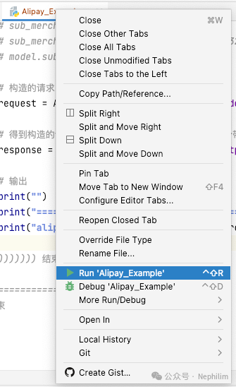 #!/usr/bin/env python# -*- coding: UTF-8 -*-# ——————————————————# 脚本说明:# xxxxxxxxx# ——————————————————# ========================================# 开始# ))))))))) 模块包导入import loggingimport tracebackimport osimport syssys.path.append('/Users/adamhuan/PycharmProjects/django_daily_media')os.environ.setdefault('DJANGO_SETTINGS_MODULE', 'django_daily_media.settings')from django.conf import settingsfrom alipay.aop.api.AlipayClientConfig import AlipayClientConfigfrom alipay.aop.api.DefaultAlipayClient import DefaultAlipayClientfrom alipay.aop.api.FileItem import FileItemfrom alipay.aop.api.domain.AlipayTradeAppPayModel import AlipayTradeAppPayModelfrom alipay.aop.api.domain.AlipayTradePagePayModel import AlipayTradePagePayModelfrom alipay.aop.api.domain.AlipayTradePayModel import AlipayTradePayModelfrom alipay.aop.api.domain.GoodsDetail import GoodsDetailfrom alipay.aop.api.domain.SettleDetailInfo import SettleDetailInfofrom alipay.aop.api.domain.SettleInfo import SettleInfofrom alipay.aop.api.domain.SubMerchant import SubMerchantfrom alipay.aop.api.request.AlipayOfflineMaterialImageUploadRequest import AlipayOfflineMaterialImageUploadRequestfrom alipay.aop.api.request.AlipayTradeAppPayRequest import AlipayTradeAppPayRequestfrom alipay.aop.api.request.AlipayTradePagePayRequest import AlipayTradePagePayRequestfrom alipay.aop.api.request.AlipayTradePayRequest import AlipayTradePayRequestfrom alipay.aop.api.response.AlipayOfflineMaterialImageUploadResponse import AlipayOfflineMaterialImageUploadResponsefrom alipay.aop.api.response.AlipayTradePayResponse import AlipayTradePayResponse# ))))))))) 日志logging.basicConfig(level=logging.INFO,format='%(asctime)s %(levelname)s %(message)s',filemode='a',)logger = logging.getLogger('')# ))))))))) 类名# ))))))))) 执行阶段if __name__ == '__main__':"""设置配置,包括支付宝网关地址、app_id、应用私钥、支付宝公钥等,其他配置值可以查看AlipayClientConfig的定义。"""alipay_client_config = AlipayClientConfig()# =================# Default# =================# 旧版本的API:openapi.alipay.com# 新版本的API:openapi-sandbox.dl.alipaydev.com# alipay_client_config.server_url = 'https://openapi.alipay.com/gateway.do'# alipay_client_config.app_id = '[your app_id]'# alipay_client_config.app_private_key = '[your app private key]'# alipay_client_config.alipay_public_key = '[alipay public key]'# =================# For Django Custom# =================alipay_client_config.server_url = settings.ALIPAY_SERVER_URLalipay_client_config.app_id = settings.ALIPAY_APP_IDalipay_client_config.app_private_key = settings.ALIPAY_APP_PRIVATE_KEYalipay_client_config.alipay_public_key = settings.ALIPAY_PUBLIC_KEY# 输出print("")print("==========================================")print(settings.ALIPAY_SERVER_URL)"""得到客户端对象。注意,一个alipay_client_config对象对应一个DefaultAlipayClient,定义DefaultAlipayClient对象后,alipay_client_config不得修改,如果想使用不同的配置,请定义不同的DefaultAlipayClient。logger参数用于打印日志,不传则不打印,建议传递。"""client = DefaultAlipayClient(alipay_client_config=alipay_client_config, logger=logger)"""页面接口示例:alipay.trade.page.pay「选择需要的接口」"""# 对照接口文档,构造请求对象model = AlipayTradePagePayModel()# 请求参数:必选model.out_trade_no = "pay201805020000226"model.total_amount = 50model.subject = "测试"model.body = "支付宝测试"model.product_code = "FAST_INSTANT_TRADE_PAY"# 请求参数:可选# settle_detail_info = SettleDetailInfo()# settle_detail_info.amount = 50# settle_detail_info.trans_in_type = "userId"# settle_detail_info.trans_in = "2088302300165604"# settle_detail_infos = list()# settle_detail_infos.append(settle_detail_info)# settle_info = SettleInfo()# settle_info.settle_detail_infos = settle_detail_infos# model.settle_info = settle_info# sub_merchant = SubMerchant()# sub_merchant.merchant_id = "2088301300153242"# model.sub_merchant = sub_merchant# 构造的请求request = AlipayTradePagePayRequest(biz_model=model)# 得到构造的请求,如果http_method是GET,则是一个带完成请求参数的url,如果http_method是POST,则是一段HTML表单片段response = client.page_execute(request, http_method="GET")# 输出print("")print("==========================================")print("alipay.trade.page.pay response:" + response)# ))))))))) 结束# ========================================# 结束