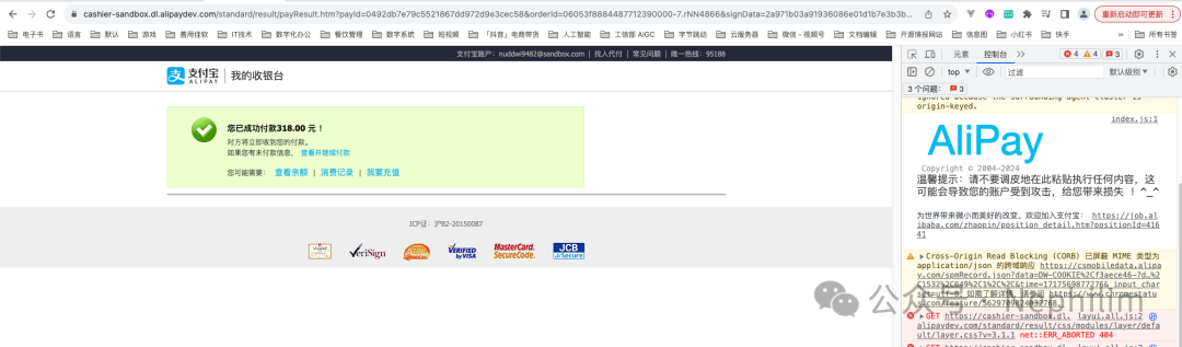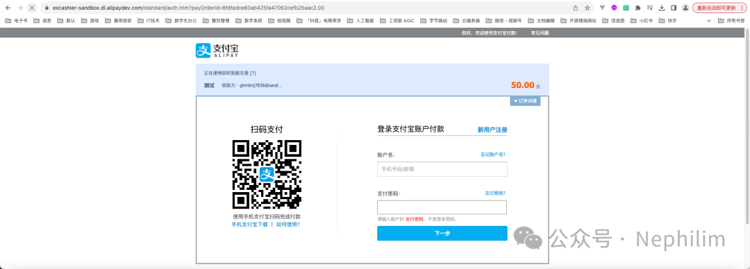 然后,在浏览器中打开最后输出的链接「alipay.trade.page.pay response」