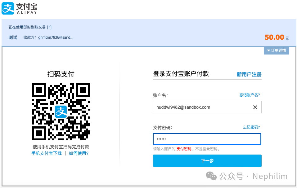至此,一个简单的支付宝「沙箱环境」的「交易功能」的演示,就完成了。