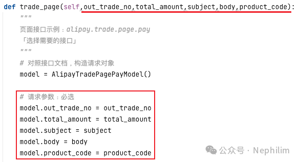 这段代码需要注意的是,前面我们在时序图中可以看到,使用的接口是「alipay.trade.page.pay」