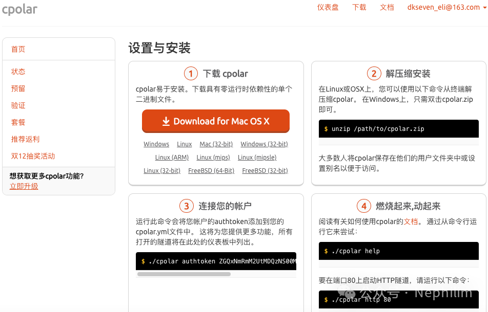(base) adamhuan@Leviathan cpolar % pwd/Users/adamhuan/cpolar(base) adamhuan@Leviathan cpolar %(base) adamhuan@Leviathan cpolar % ls -ltrtotal 14144-rw-r--r--@ 1 adamhuan staff 7241308 6 5 15:07 cpolar-stable-darwin-arm64.zip(base) adamhuan@Leviathan cpolar %(base) adamhuan@Leviathan cpolar % unzip cpolar-stable-darwin-arm64.zipArchive: cpolar-stable-darwin-arm64.zipinflating: cpolar(base) adamhuan@Leviathan cpolar %(base) adamhuan@Leviathan cpolar % ls -ltrtotal 52752-rwxr-xr-x@ 1 adamhuan staff 19764592 11 5 2022 cpolar-rw-r--r--@ 1 adamhuan staff 7241308 6 5 15:07 cpolar-stable-darwin-arm64.zip(base) adamhuan@Leviathan cpolar %(base) adamhuan@Leviathan cpolar % ./cpolar helpUsage: ./cpolar <command> [OPTIONS] <local port or address>Options:Examples:cpolar http 80 # secure public URL for port 80 website servercpolar http -subdomain=baz 8080 # port 8080 available at baz.cpolar.iocpolar http foo.dev:80 # tunnel to host:port instead of localhostcpolar tcp 22 # tunnel arbitrary TCP traffic to port 22cpolar http -hostname="example.com" -httpauth="user:password" 10.0.0.1:8080cpolar ftp 21 # tunnel to port 21 for ftp servercpolar tls 443 # create tls tunnelcpolar service install # install cpolar daemoncpolar service start # start cpolar daemoncpolar service stop # stop cpolar daemoncpolar service uninstall # uninstall cpolar daemonAdvanced usage: cpolar <command> [OPTIONS] [command args] [...]Commands:cpolar authtoken Save authtoken to configuration filecpolar http Start an http tunnelcpolar tcp Start a tcp tunnelcpolar start [tunnel] [...] Start tunnels by name from config filecpolar start-all Start all tunnels defined in config filecpolar list List tunnel names from config filecpolar help Print helpcpolar version Print cpolar versioncpolar ftp Start a ftp tunnelcpolar tls Start a tls tunnelcpolar service <install|start|stop|uninstall> Daemon ManagerExamples:cpolar start www api blog pubsubcpolar start ssh -log=stdout -config=cpolar.ymlcpolar start-allcpolar versioncpolar service installcpolar service startcpolar service stopcpolar service uninstallcpolar http 8080cpolar is a command line application, try typing 'cpolar http 8080'at this terminal prompt to expose port 8080.(base) adamhuan@Leviathan cpolar %