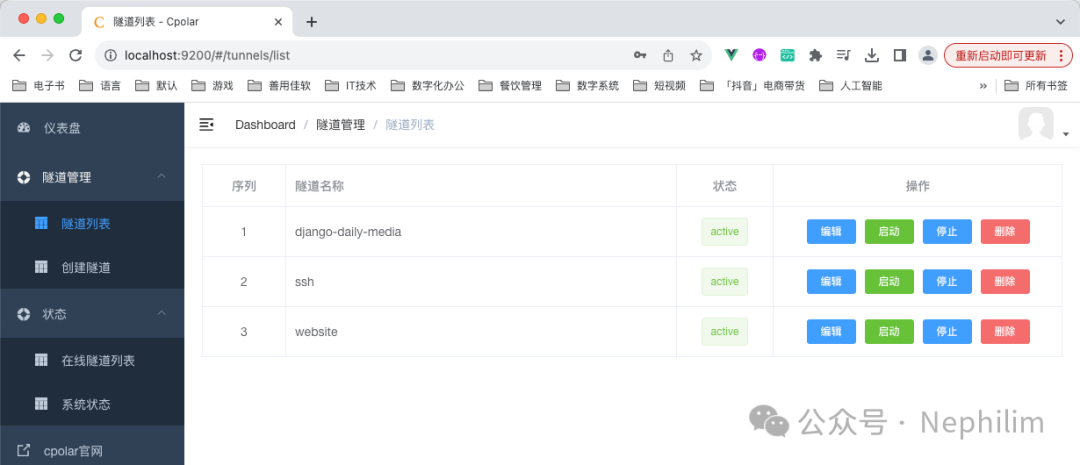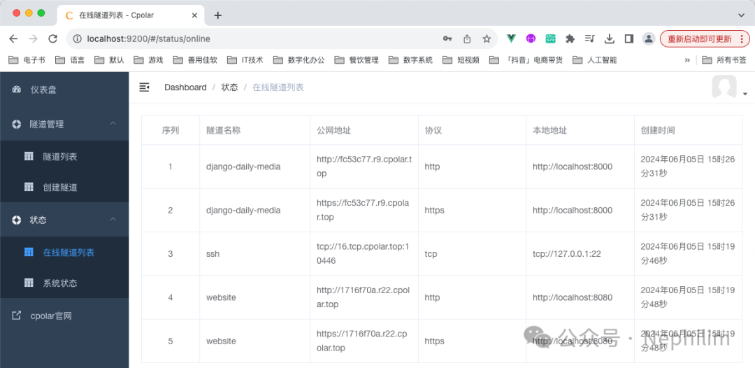 最后,点击「创建」,创建成功后,就可以在「隧道列表」中看到了: