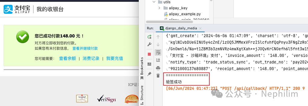 当你完成了上面的配置后,当你再次完成支付后,你的PyCharm的命令行就可以拿到支付宝反馈回来的「通知信息」: