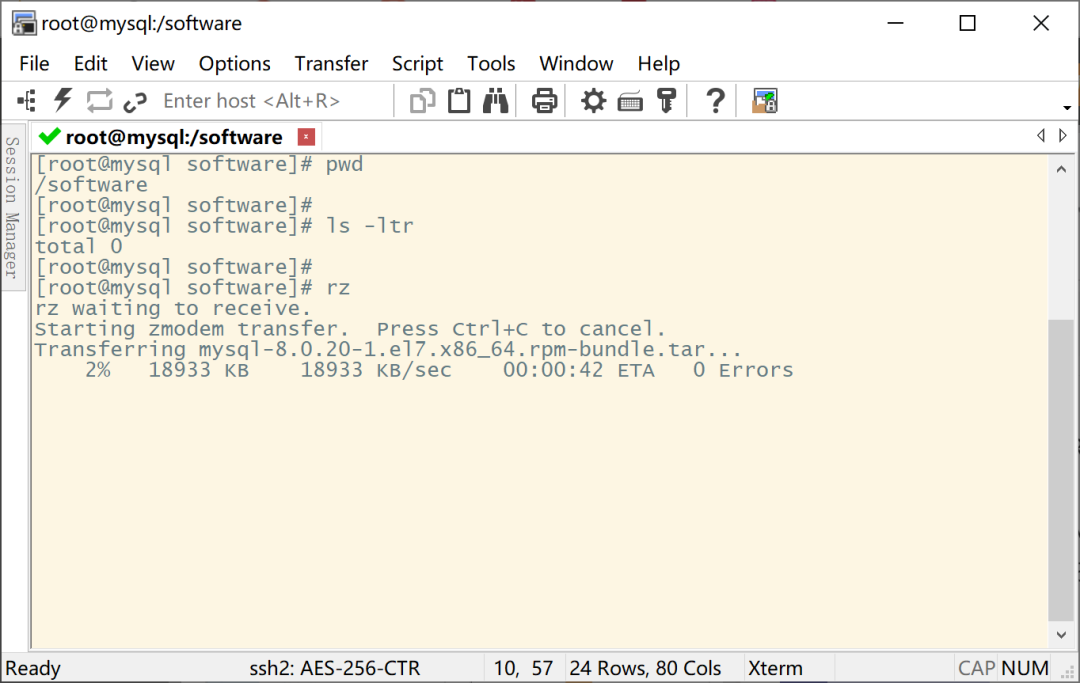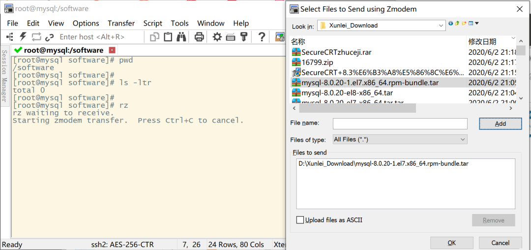 [root@mysql software]# pwd/software[root@mysql software]#[root@mysql software]# ls -ltrtotal 0[root@mysql software]#[root@mysql software]# rzrz waiting to receive.Starting zmodem transfer. Press Ctrl+C to cancel.Transferring mysql-8.0.20-1.el7.x86_64.rpm-bundle.tar...100% 815000 KB 14553 KB/sec 00:00:56 0 Errors[root@mysql software]#[root@mysql software]# ls -ltrtotal 815000-rw-r--r--. 1 root root 834560000 Jun 2 21:05 mysql-8.0.20-1.el7.x86_64.rpm-bundle.tar[root@mysql software]# du -sh *796M mysql-8.0.20-1.el7.x86_64.rpm-bundle.tar[root@mysql software]#