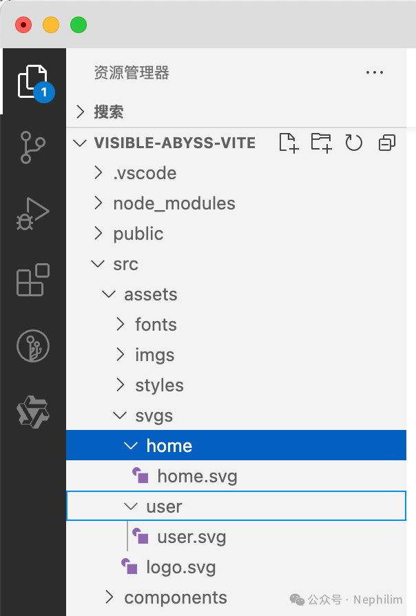 根据前面的配置,在「src/assets/svgs」下,创建目录「user home」,并在其中放入一些图标: