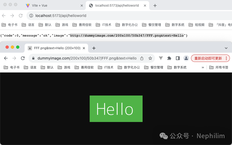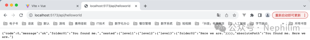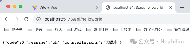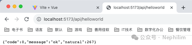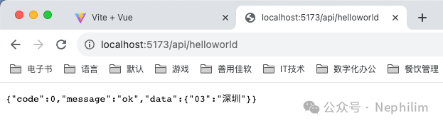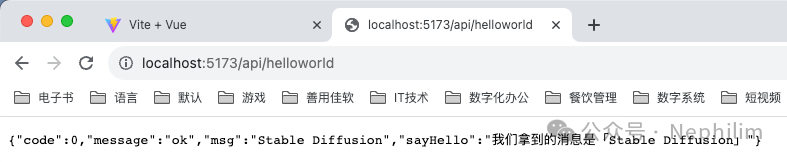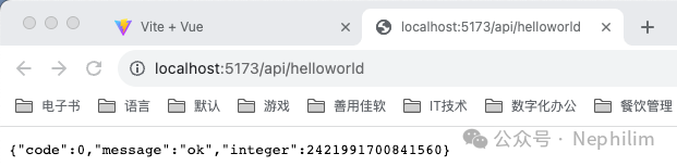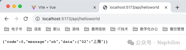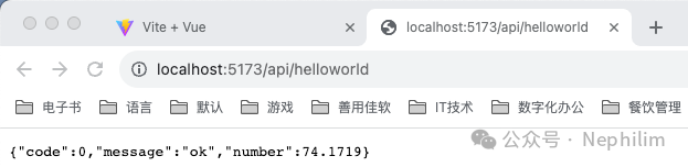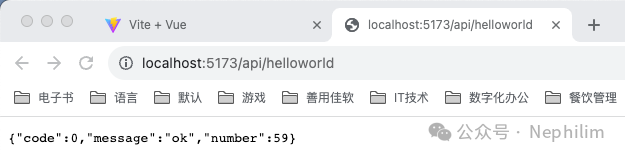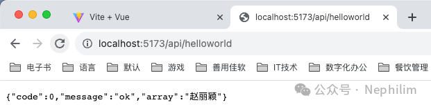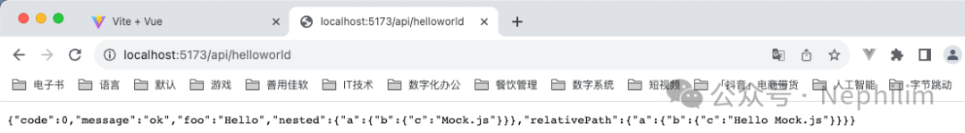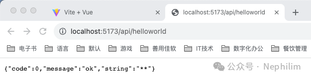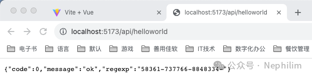 在页面上访问你配置的API「/api/helloworld」你就可以看到你的Mock.js的接口输出的内容了: