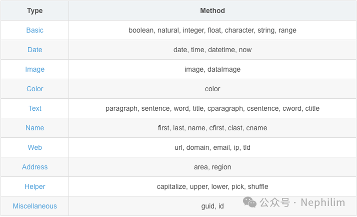 // Random.paragraph()Random.paragraph()Mock.mock('@paragraph')Mock.mock('@paragraph()')// Random.paragraph( len )Random.paragraph(2)Mock.mock('@paragraph(2)')// Random.paragraph( min, max )Random.paragraph(1, 3)Mock.mock('@paragraph(1, 3)')// Random.sentence()Random.sentence()Mock.mock('@sentence')Mock.mock('@sentence()')// Random.sentence( len )Random.sentence(5)Mock.mock('@sentence(5)')// Random.sentence( min, max )Random.sentence(3, 5)Mock.mock('@sentence(3, 5)')// Random.word()Random.word()Mock.mock('@word')Mock.mock('@word()')// Random.word( len )Random.word(5)Mock.mock('@word(5)')// Random.word( min, max )Random.word(3, 5)Mock.mock('@word(3, 5)')// Random.title()Random.title()Mock.mock('@title')Mock.mock('@title()')// Random.title( len )Random.title(5)Mock.mock('@title(5)')// Random.title( min, max )Random.title(3, 5)Mock.mock('@title(3, 5)')// Random.cparagraph()Random.cparagraph()Mock.mock('@cparagraph')Mock.mock('@cparagraph()')// Random.cparagraph( len )Random.cparagraph(2)Mock.mock('@cparagraph(2)')// Random.cparagraph( min, max )Random.cparagraph(1, 3)Mock.mock('@cparagraph(1, 3)')// Random.csentence()Random.csentence()Mock.mock('@csentence')Mock.mock('@csentence()')// Random.csentence( len )Random.csentence(5)Mock.mock('@csentence(5)')// Random.csentence( min, max )Random.csentence(3, 5)Mock.mock('@csentence(3, 5)')// Random.cword()Random.cword()Mock.mock('@cword')Mock.mock('@cword()')// Random.cword( pool )Random.cword('零一二三四五六七八九十')Mock.mock('@cword("零一二三四五六七八九十")')// Random.cword( length )Random.cword(3)Mock.mock('@cword(3)')// Random.cword( pool, length )Random.cword('零一二三四五六七八九十', 3)Mock.mock('@cword("零一二三四五六七八九十", 3)')// Random.cword( min, max )Random.cword(3, 5)Mock.mock('@cword(3, 5)')// Random.cword( pool, min, max )Random.cword('零一二三四五六七八九十', 5, 7)Mock.mock('@cword("零一二三四五六七八九十", 5, 7)')// Random.ctitle()Random.ctitle()Mock.mock('@ctitle')Mock.mock('@ctitle()')// Random.ctitle( len )Random.ctitle(5)Mock.mock('@ctitle(5)')// Random.ctitle( min, max )Random.ctitle(3, 5)Mock.mock('@ctitle(3, 5)')