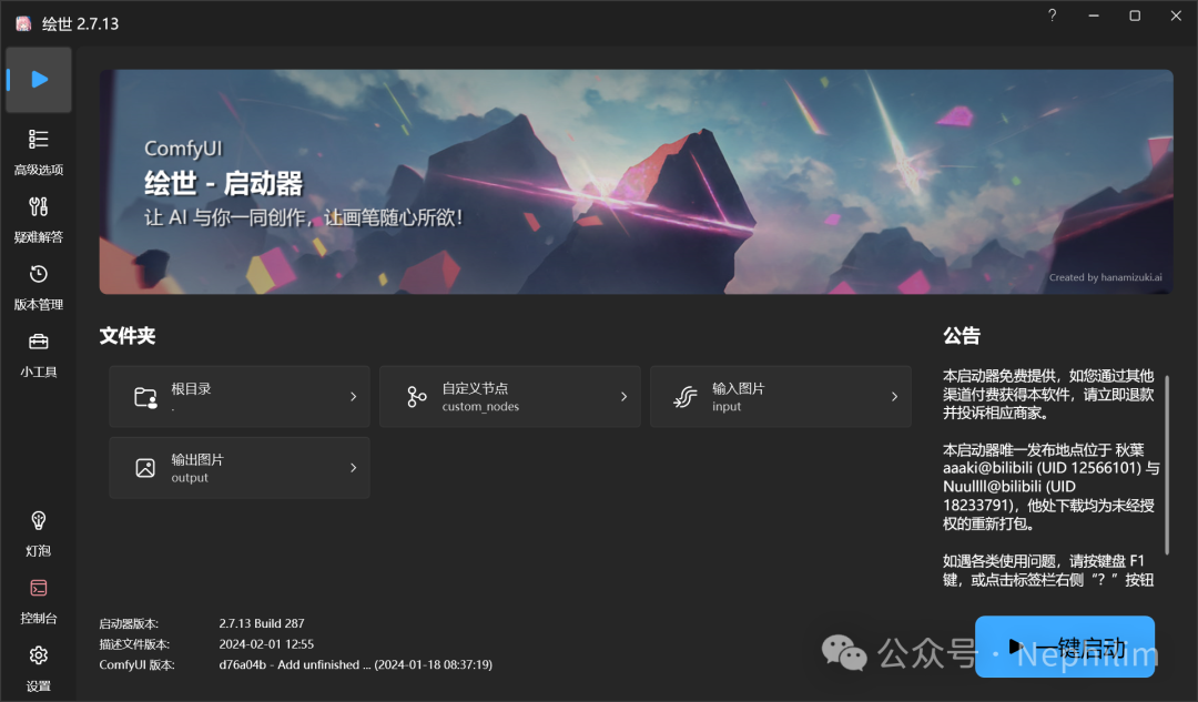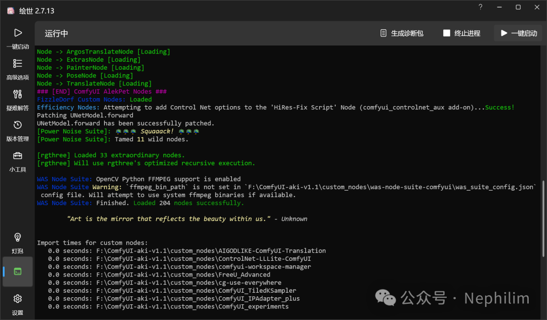 然后,通过启动器中的【一键启动】去拉起ComfyUI的进程: