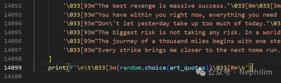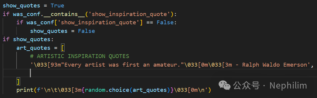 show_quotes = Trueif was_conf.__contains__('show_inspiration_quote'):if was_conf['show_inspiration_quote'] == False:show_quotes = Falseif show_quotes:art_quotes = [# 《繁花》'\033[93m"Every artist was first an amateur."\033[0m\033[3m - Ralph Waldo Emerson','\033[93m"人人心里有杆秤,什么时候可以同富贵,什么时候可以共患难,心里多少都有数的"\033[0m\033[3m - 宝总','\033[93m"男女之事,源自天时地利,差一分一厘,就是空门"\033[0m\033[3m - 宝总','\033[93m"钥匙,就是人,是一种关系。单把钥匙,并入其他钥匙圈里,状况就不一样"\033[0m\033[3m - 宝总','\033[93m"钥匙越多,声音响很多,事情就越复杂,烦"\033[0m\033[3m - 宝总','\033[93m"所谓出人头地,就是被人教训的过程"\033[0m\033[3m - 宝总','\033[93m"好好庆功,就能成功"\033[0m\033[3m - 汪小姐','\033[93m"树大招风,你生意做得越好,当然要找你麻烦"\033[0m\033[3m - 爷叔','\033[93m"人生知无二三,不如意事常八九,就是最好的朋友,最后也事各归各"\033[0m\033[3m - 宝总',# 王者荣耀'\033[93m"觉醒吧,猎杀时刻"\033[0m\033[3m - 觉醒吧,猎杀时刻','\033[93m"剑指的方向,就是天才的故乡"\033[0m\033[3m - 曜','\033[93m"放下带着自然之灵祝福的弓箭"\033[0m\033[3m - 虞姬','\033[93m"饮血的剑,越发空虚"\033[0m\033[3m - 铠','\033[93m"城头画角起,飞鹰踏云出"\033[0m\033[3m - 曜',]print(f'\n\t\033[3m{random.choice(art_quotes)}\033[0m\n')