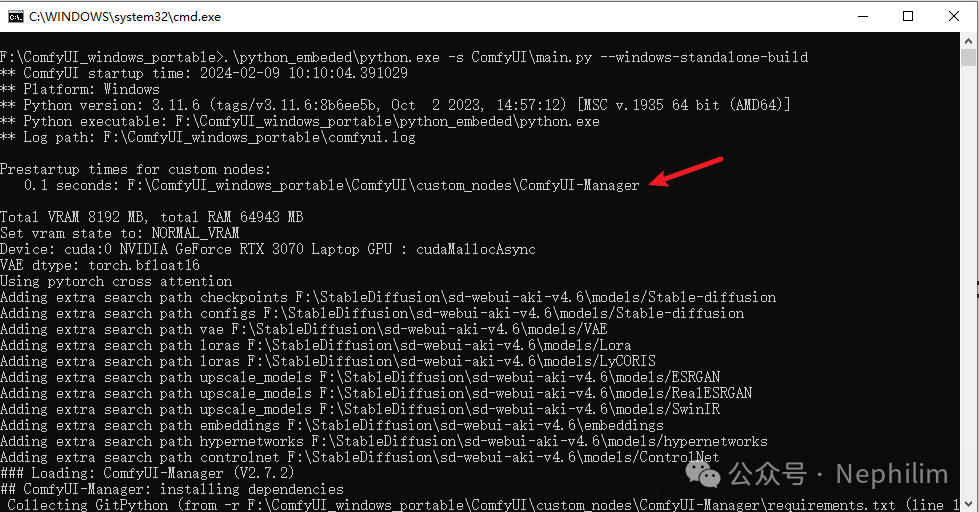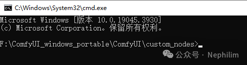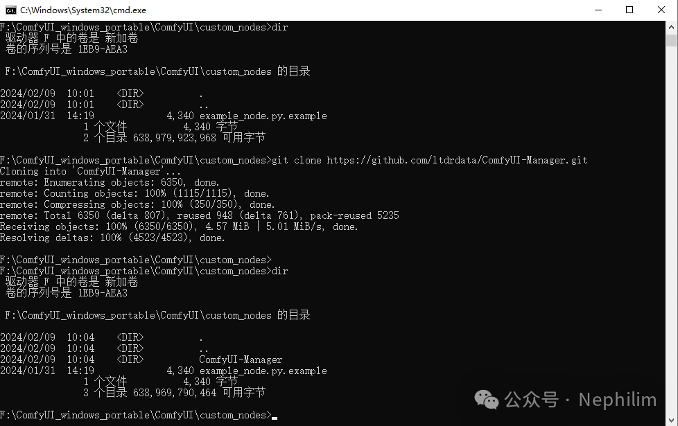 F:\ComfyUI_windows_portable\ComfyUI\custom_nodes>dir驱动器 F 中的卷是 新加卷卷的序列号是 1EB9-AEA3F:\ComfyUI_windows_portable\ComfyUI\custom_nodes 的目录2024/02/09 10:01 <DIR> .2024/02/09 10:01 <DIR> ..2024/01/31 14:19 4,340 example_node.py.example1 个文件 4,340 字节2 个目录 638,979,923,968 可用字节F:\ComfyUI_windows_portable\ComfyUI\custom_nodes>git clone https://github.com/ltdrdata/ComfyUI-Manager.gitCloning into 'ComfyUI-Manager'...remote: Enumerating objects: 6350, done.remote: Counting objects: 100% (1115/1115), done.remote: Compressing objects: 100% (350/350), done.remote: Total 6350 (delta 807), reused 948 (delta 761), pack-reused 5235Receiving objects: 100% (6350/6350), 4.57 MiB | 5.01 MiB/s, done.Resolving deltas: 100% (4523/4523), done.F:\ComfyUI_windows_portable\ComfyUI\custom_nodes>F:\ComfyUI_windows_portable\ComfyUI\custom_nodes>dir驱动器 F 中的卷是 新加卷卷的序列号是 1EB9-AEA3F:\ComfyUI_windows_portable\ComfyUI\custom_nodes 的目录2024/02/09 10:04 <DIR> .2024/02/09 10:04 <DIR> ..2024/02/09 10:04 <DIR> ComfyUI-Manager2024/01/31 14:19 4,340 example_node.py.example1 个文件 4,340 字节3 个目录 638,969,790,464 可用字节F:\ComfyUI_windows_portable\ComfyUI\custom_nodes>