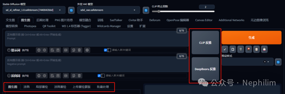 做完上面三个步骤后,「CLIP」与「Deepbooru」两个反推插件就应该可以工作正常了,图片预处理打标的功能也应该会没问题。