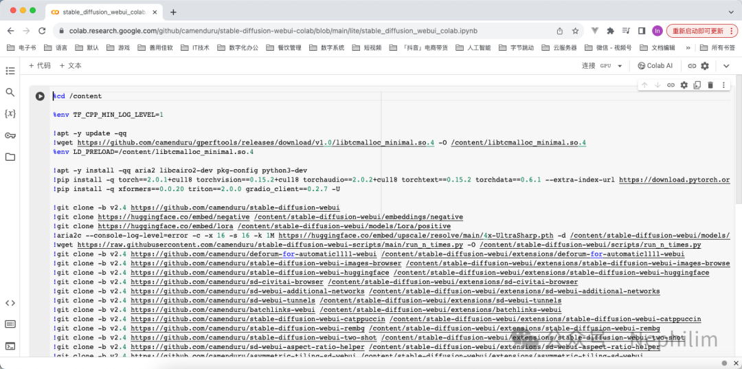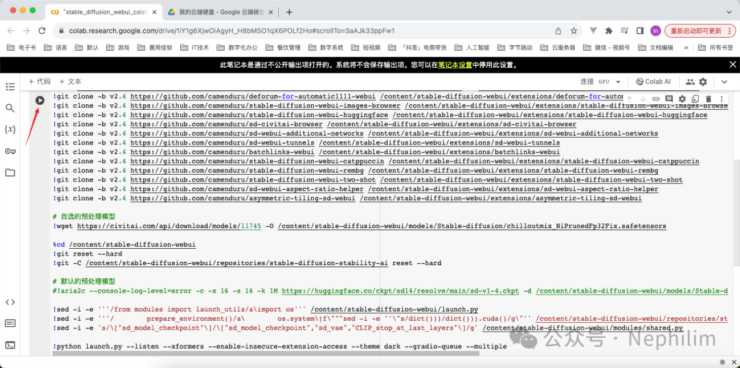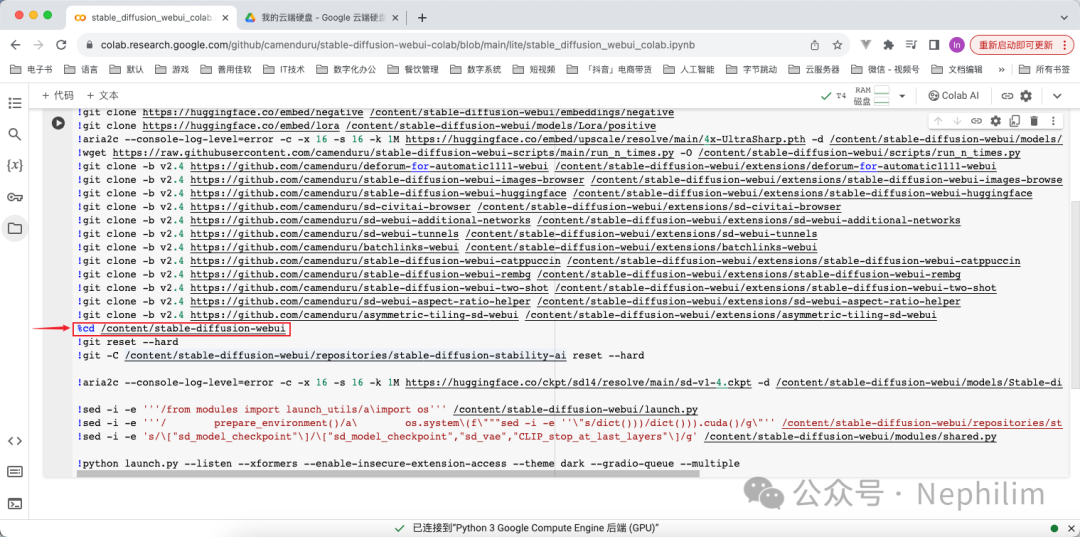 在这个Colab脚本中,你需要关注「%cd content/stable-diffusion-webui」
