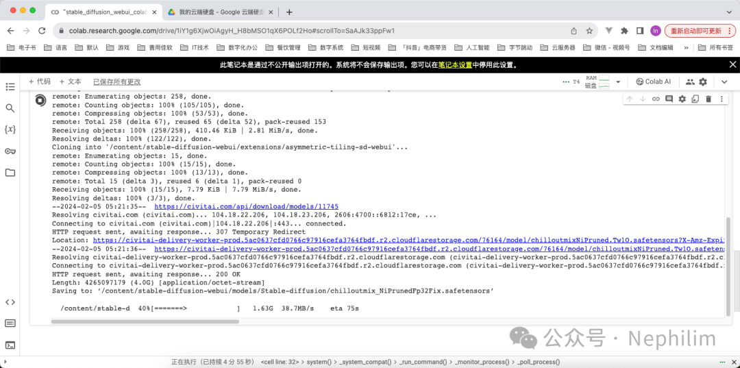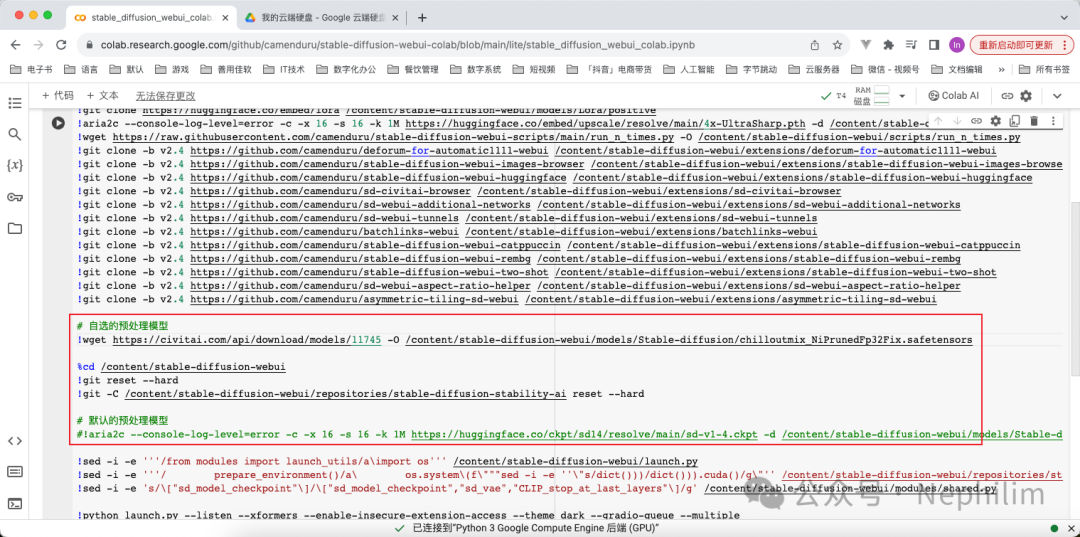 # 自选的预处理模型!wget https://civitai.com/api/download/models/11745 -O content/stable-diffusion-webui/models/Stable-diffusion/chilloutmix_NiPrunedFp32Fix.safetensors%cd content/stable-diffusion-webui!git reset --hard!git -C content/stable-diffusion-webui/repositories/stable-diffusion-stability-ai reset --hard# 默认的预处理模型#!aria2c --console-log-level=error -c -x 16 -s 16 -k 1M https://huggingface.co/ckpt/sd14/resolve/main/sd-v1-4.ckpt -d content/stable-diffusion-webui/models/Stable-diffusion -o sd-v1-4.ckpt